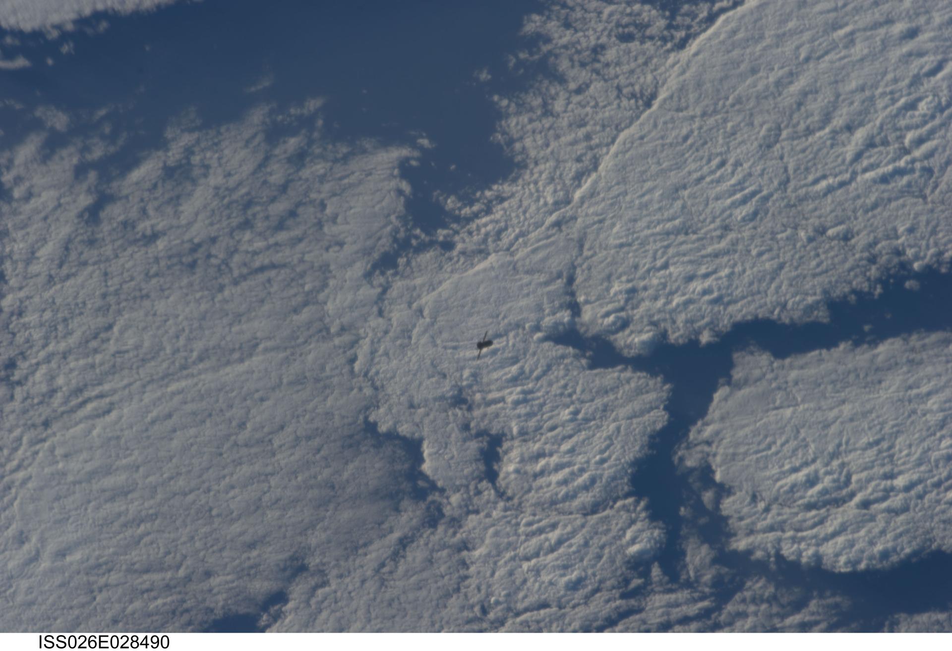 ISS026-E-028490 (20 Feb. 2011) --- Backdropped by a blue and white part of Earth, the unpiloted ISS Progress 39 supply vehicle appears to be very small as it departs from the International Space Station at 8:12 a.m. (EST) on Feb. 20, 2011. At 11:12 a.m., the deorbit burn braked the trash-loaded cargo ship into its re-entry trajectory over the Pacific Ocean, where it was burned up in Earth’s atmosphere.