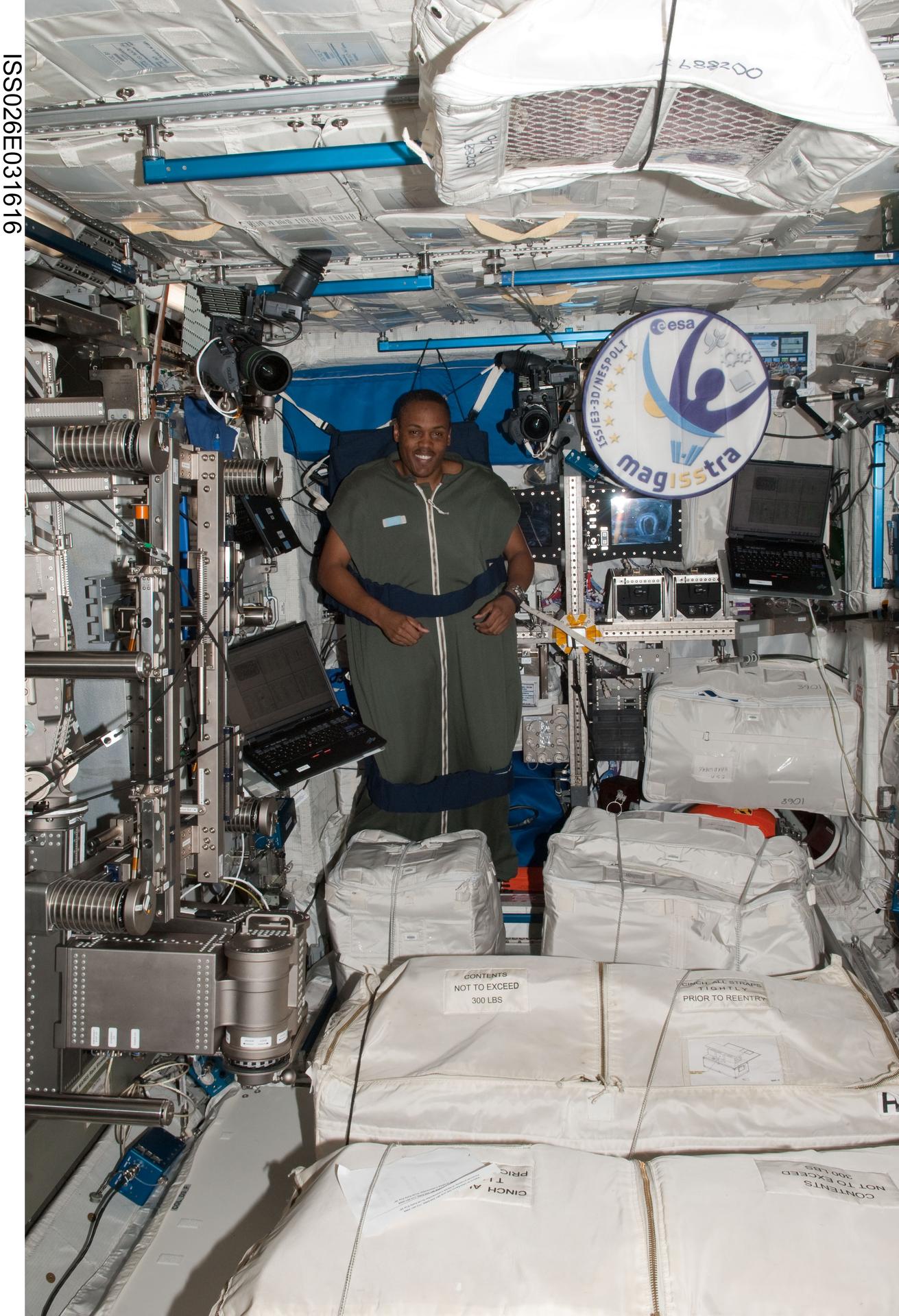 ISS026-E-031616 (3 March 2011) --- NASA astronaut Alvin Drew, STS-133 mission specialist, is pictured in his sleeping bag, which is attached in the Columbus laboratory of the International Space Station while space shuttle Discovery remains docked with the station.