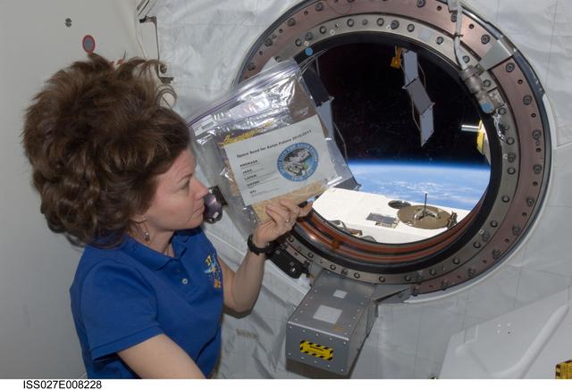 ISS027-E-008228 (26 March 2011) --- NASA astronaut Cady Coleman, Expedition 27 flight engineer, holds a bag of space seeds near a window in the Kibo laboratory of the International Space Station.