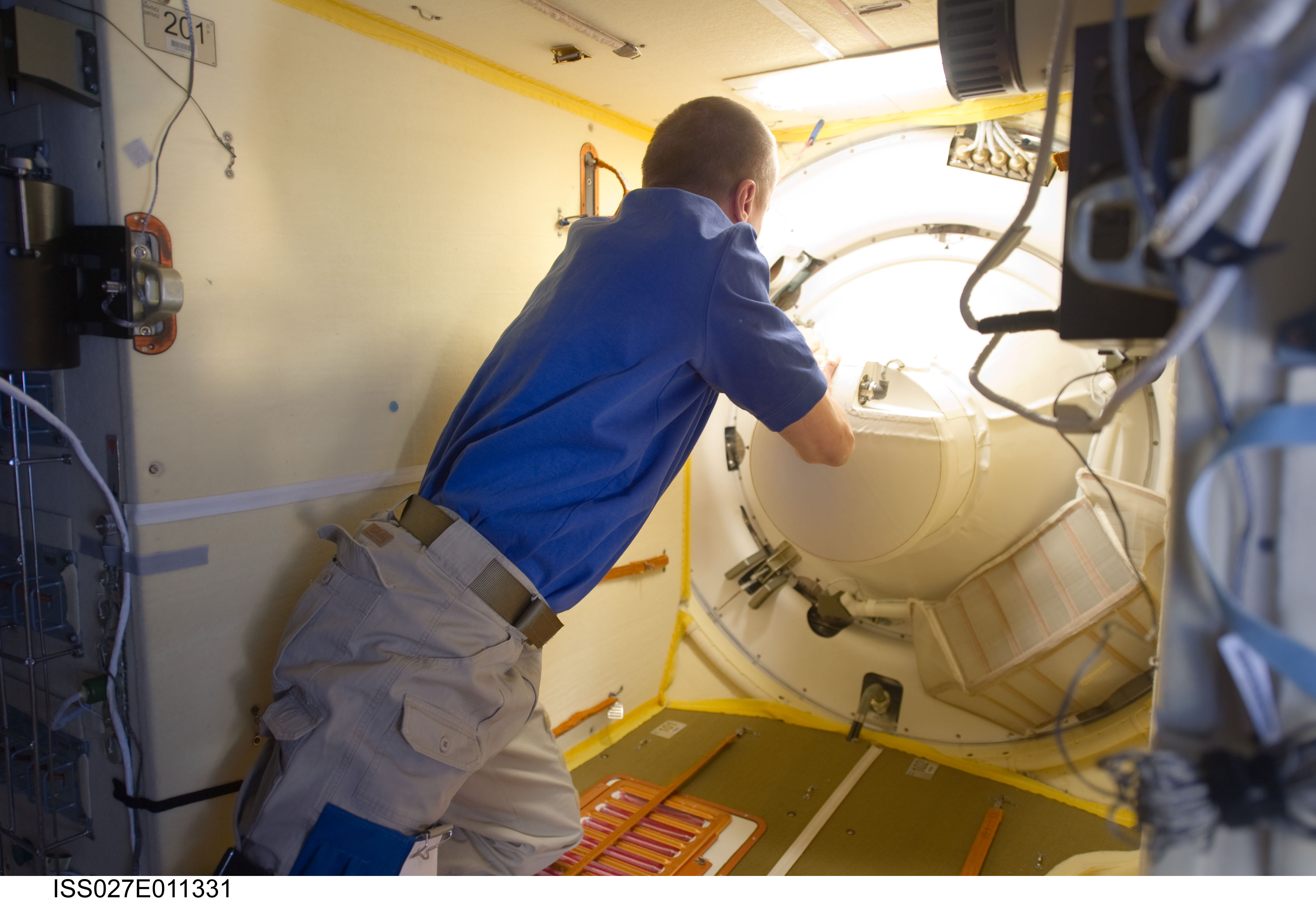 ISS027-E-011331 (6 April 2011) --- Russian cosmonaut Dmitry Kondratyev, Expedition 27 commander, prepares to open the Poisk Mini-Research Module 2 (MRM2) hatch to welcome NASA astronaut Ron Garan, along with Russian cosmonauts Andrey Borisenko and Alexander Samokutyaev, all flight engineers, to the International Space Station. The Soyuz TMA-21 docked to the MRM2 at 7:09 p.m. (EDT) on April 6, 2011.