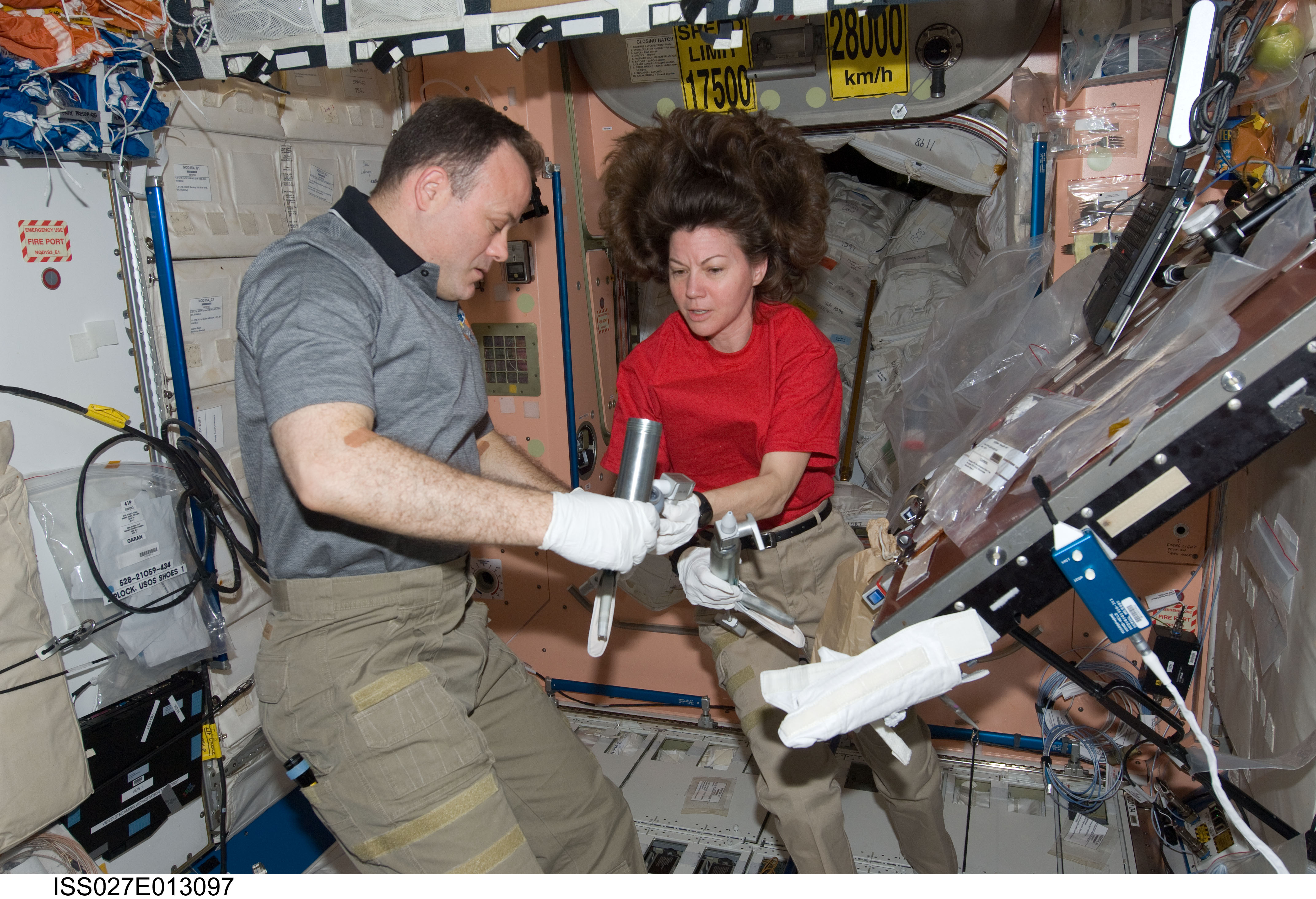 ISS027-E-013097 (15 April 2011) --- NASA astronauts Ron Garan and Cady Coleman, both Expedition 27 flight engineers, work with extravehicular activity (EVA) grease guns in the Unity node of the International Space Station.