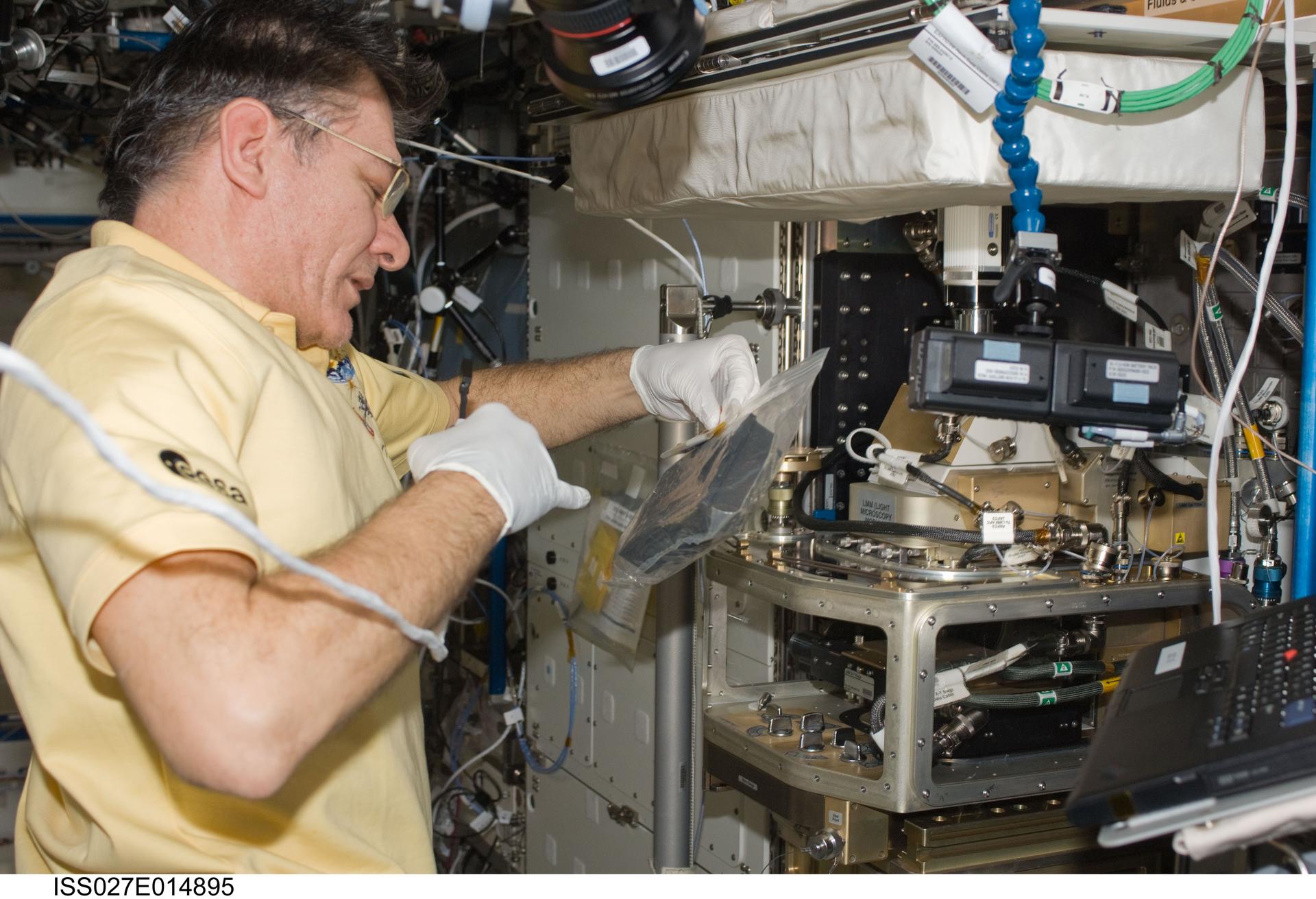 ISS027-E-014895 (21 April 2011) --- European Space Agency astronaut Paolo Nespoli, Expedition 27 flight engineer, works with the Light Microscopy Module (LMM) in the Destiny laboratory of the International Space Station.