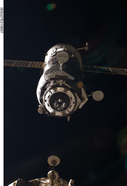 ISS027-E-015607 (22 April 2011) --- The unpiloted ISS Progress 41 supply vehicle departs from the International Space Station at 7:41 a.m. (EDT) on April 22, 2011. Filled with trash and discarded items, Progress 41 will remain in orbit a safe distance from the station for engineering tests before being commanded by flight controllers to descend to a destructive re-entry into Earth’s atmosphere over the Pacific Ocean. The departure of Progress 41 clears the way for the next unpiloted supply ship, ISS Progress 42, which is set to launch April 27 from the Baikonur Cosmodrome in Kazakhstan, delivering three tons of food, fuel and supplies for the Expedition 27 crew.