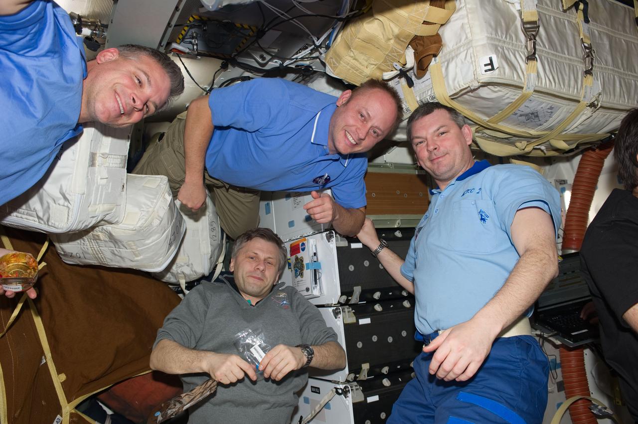 ISS028-E-005921 (27 May 2011) --- NASA astronauts Greg H. Johnson (top left), STS-134 pilot, and Michael Fincke (top center), STS-134 mission specialist; along with Russian cosmonauts Andrey Borisenko (bottom), Expedition 28 commander; and Alexander Samokutyaev, Expedition 28 flight engineer, pose for a photo on the middeck of space shuttle Endeavour while docked with the International Space Station.