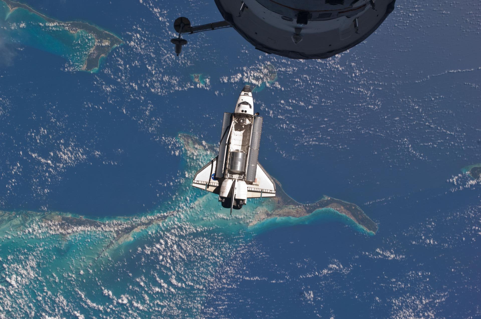 ISS028-E-015813 (10 July 2011) --- The space shuttle Atlantis is seen over the Bahamas prior to a perfect docking with the International Space Station at 10:07 a.m. (CDT). Part of a Russian Progress spacecraft which is docked to the station is in the foreground.