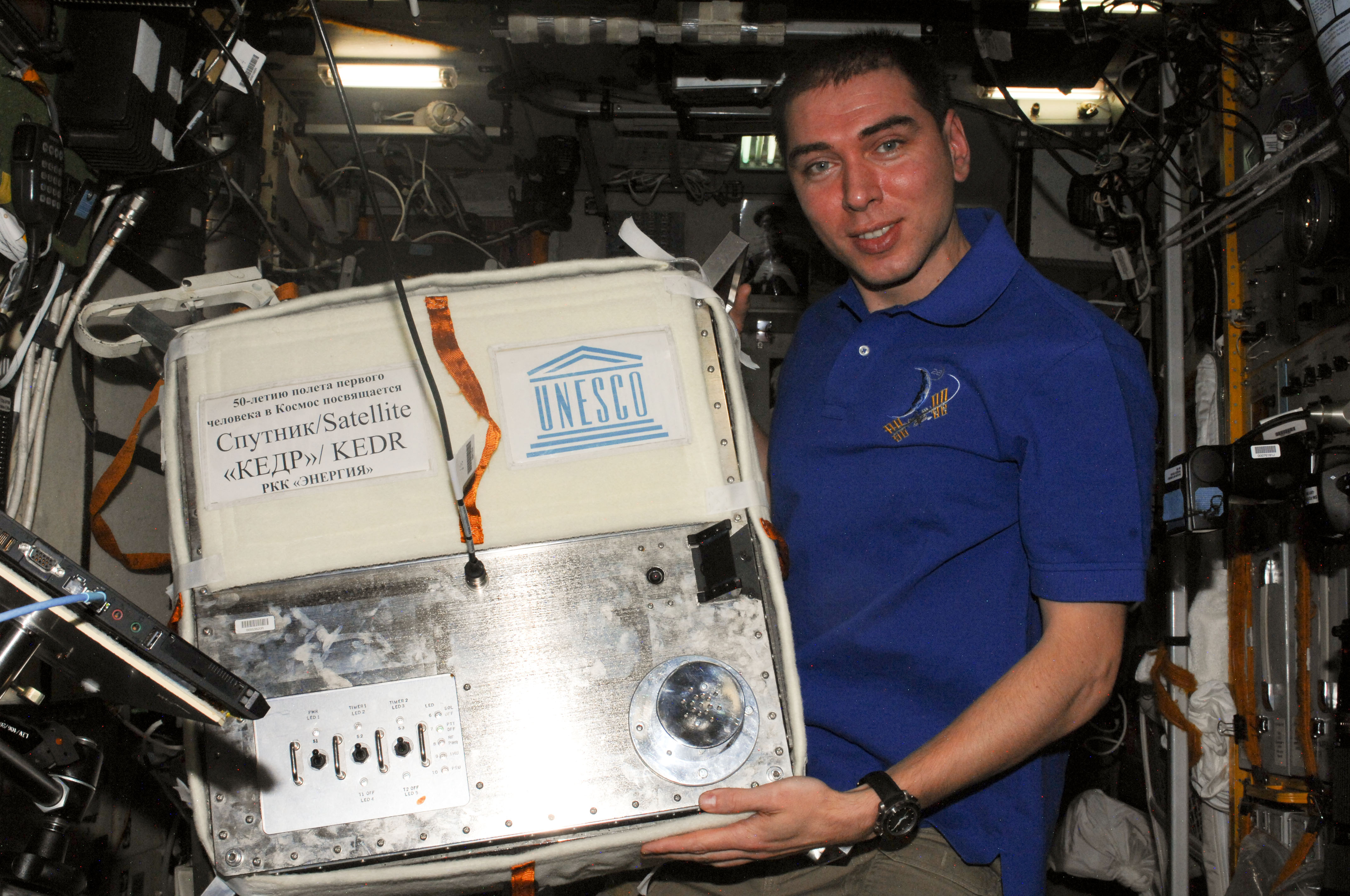 ISS028-E-020085 (30 July 2011) --- Russian cosmonaut Sergei Volkov, Expedition 28 flight engineer, poses for a photo with the KEDR satellite in the Zvezda Service Module of the International Space Station. Volkov and Russian cosmonaut Alexander Samokutyaev (out of frame), flight engineer, will deploy the satellite during their spacewalk scheduled for Aug. 3, 2011.