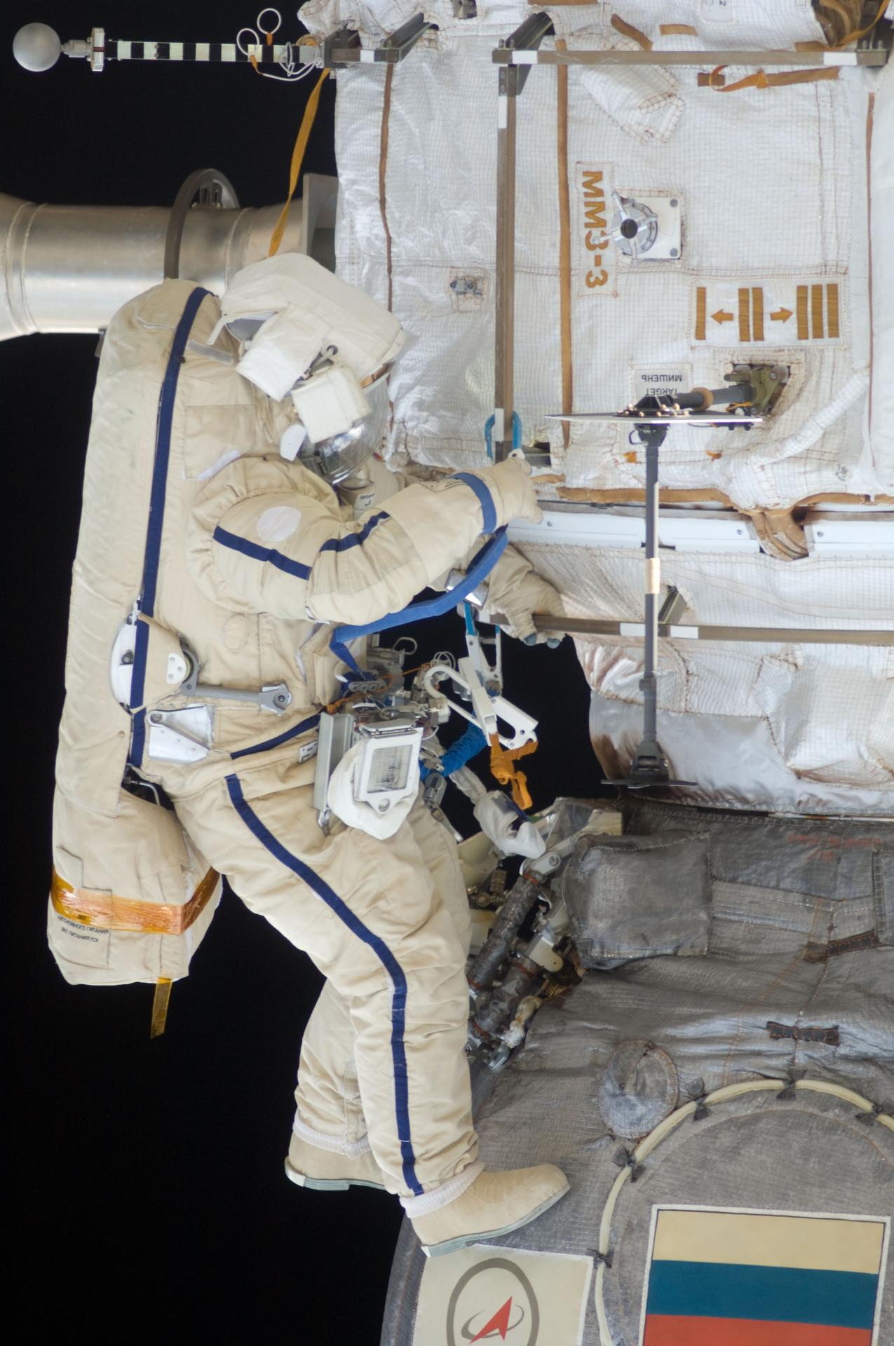 ISS028-E-020930 (3 Aug. 2011) --- Russian cosmonauts Sergei Volkov and Alexander Samokutyaev (out of frame), both Expedition 28 flight engineers, attired in Russian Orlan spacesuits, participate in a session of extravehicular activity (EVA) on the Russian segment of the International Space Station. During the six-hour, 23-minute spacewalk, Volkov and Samokutyaev moved a cargo boom from one airlock to another, installed a prototype laser communications system and deployed an amateur radio micro-satellite.