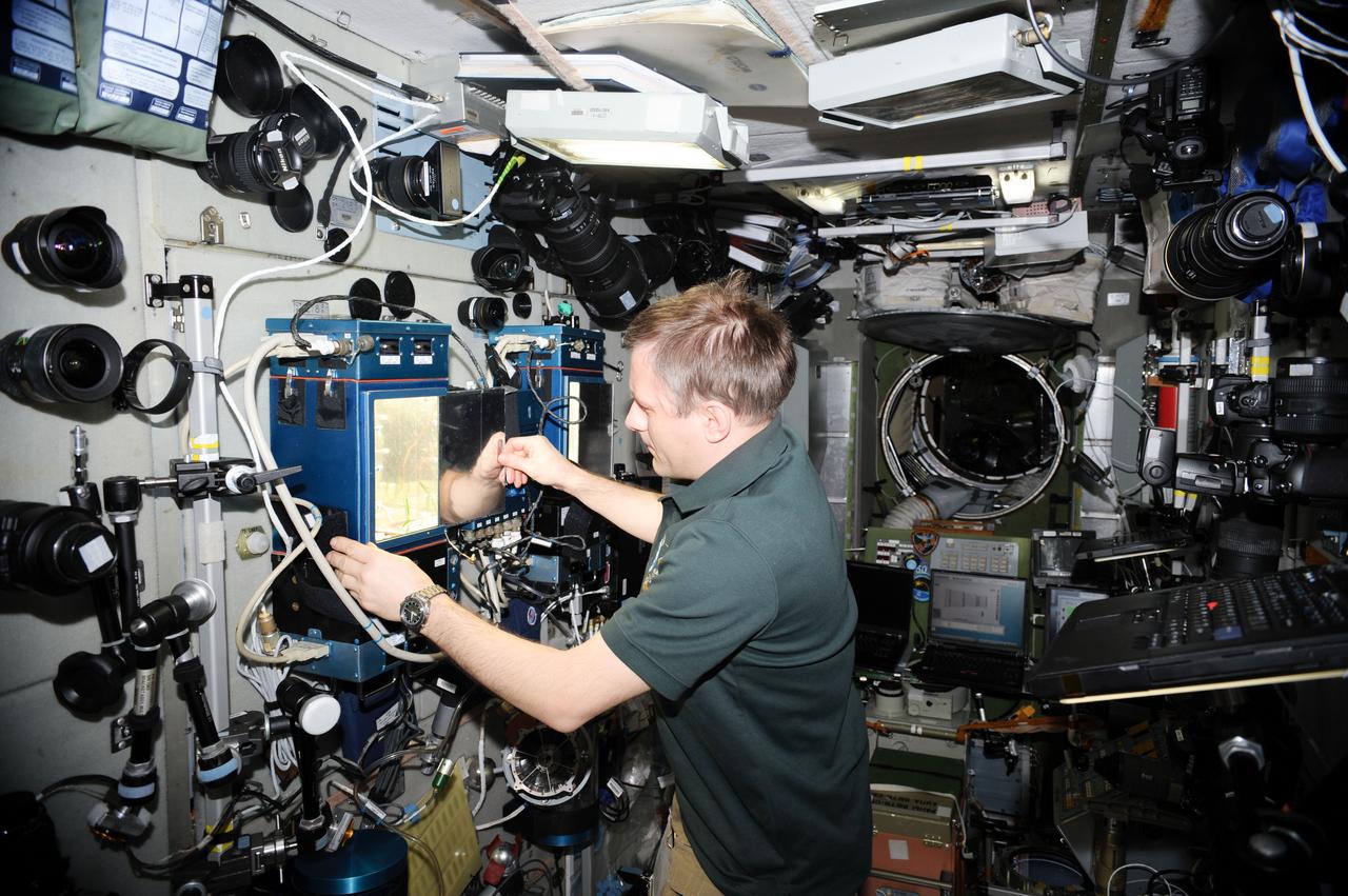 ISS028-E-025963 (18 Aug. 2011) --- Russian cosmonaut Andrey Borisenko, Expedition 28 commander, inspects a new growth experiment on the BIO-5 Rasteniya-2 (Plants-2) payload with its LADA-01 greenhouse in the Zvezda Service Module of the International Space Station.