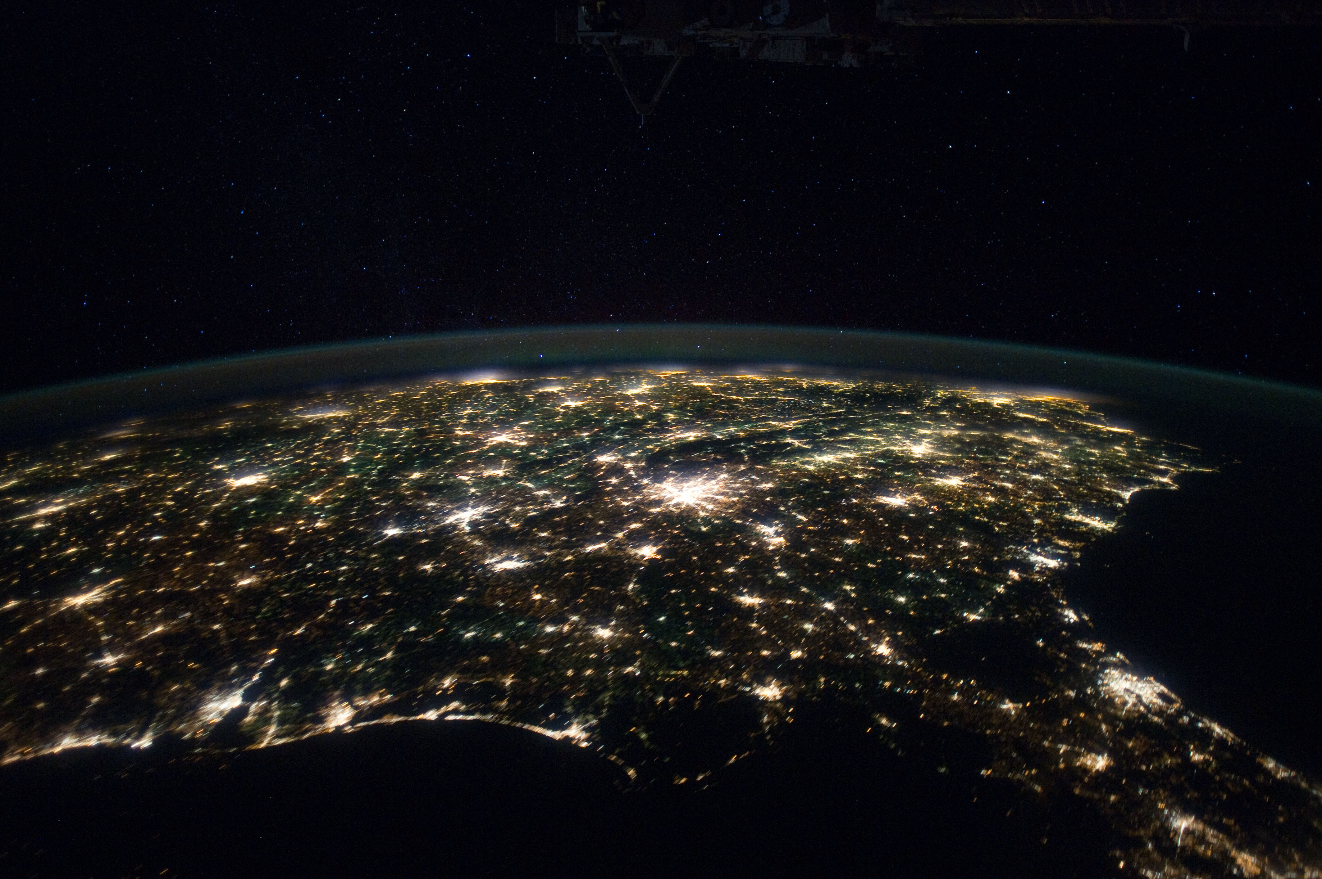 ISS030-E-055569 (29 Jan. 2012) --- Southeastern USA at night is featured in this image photographed by an Expedition 30 crew member on the International Space Station. The brightly lit metropolitan areas of Atlanta, GA (center) and Jacksonville, FL (lower right) appear largest in the image with numerous other urban areas forming an interconnected network of light across the region. A large dark region to the northwest of Jacksonville, FL is the Okefenokee National Wildlife Refuge; likewise the ridges of the Appalachian Mountains form dark swaths to the north of Atlanta, GA and west of Charlotte, NC (center). The faint gold and green line of airglow—caused by ultraviolet radiation exciting the gas molecules in the upper atmosphere—parallels the horizon (or Earth limb).