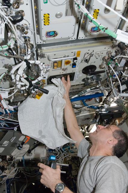 ISS030-E-074046 (12 Feb. 2012) --- NASA astronaut Don Pettit, Expedition 30 flight engineer, performs in-flight maintenance on the Potable Water Dispenser (PWD) in the Destiny laboratory of the International Space Station.