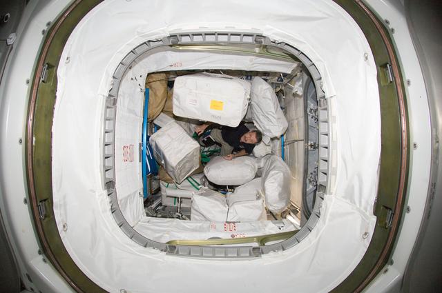 ISS030-E-115930 (2 March 2012) --- NASA astronaut Dan Burbank, Expedition 30 commander, is pictured among stowage containers in the Leonardo Permanent Multipurpose Module (PMM) of the International Space Station.