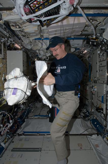 ISS030-E-122089 (6 March 2012) --- NASA astronaut Dan Burbank, Expedition 30 commander, opens a Contingency Water Container-Iodinated (CWC-I) bag in the Kibo laboratory of the International Space Station.