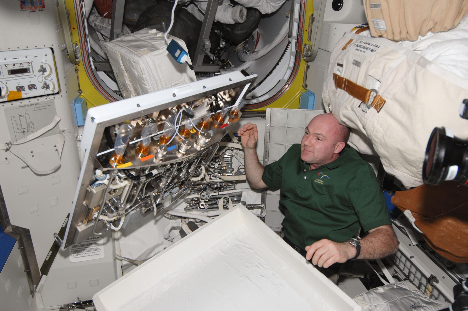 ISS030-E-156468 (27 Jan. 2012) --- European Space Agency astronaut Andre Kuipers, Expedition 30 flight engineer, is pictured in the Quest airlock of the International Space Station during photo documentation of the fluid and electrical interfaces on the Umbilical Interface Assembly (UIA) Connector Shelf.