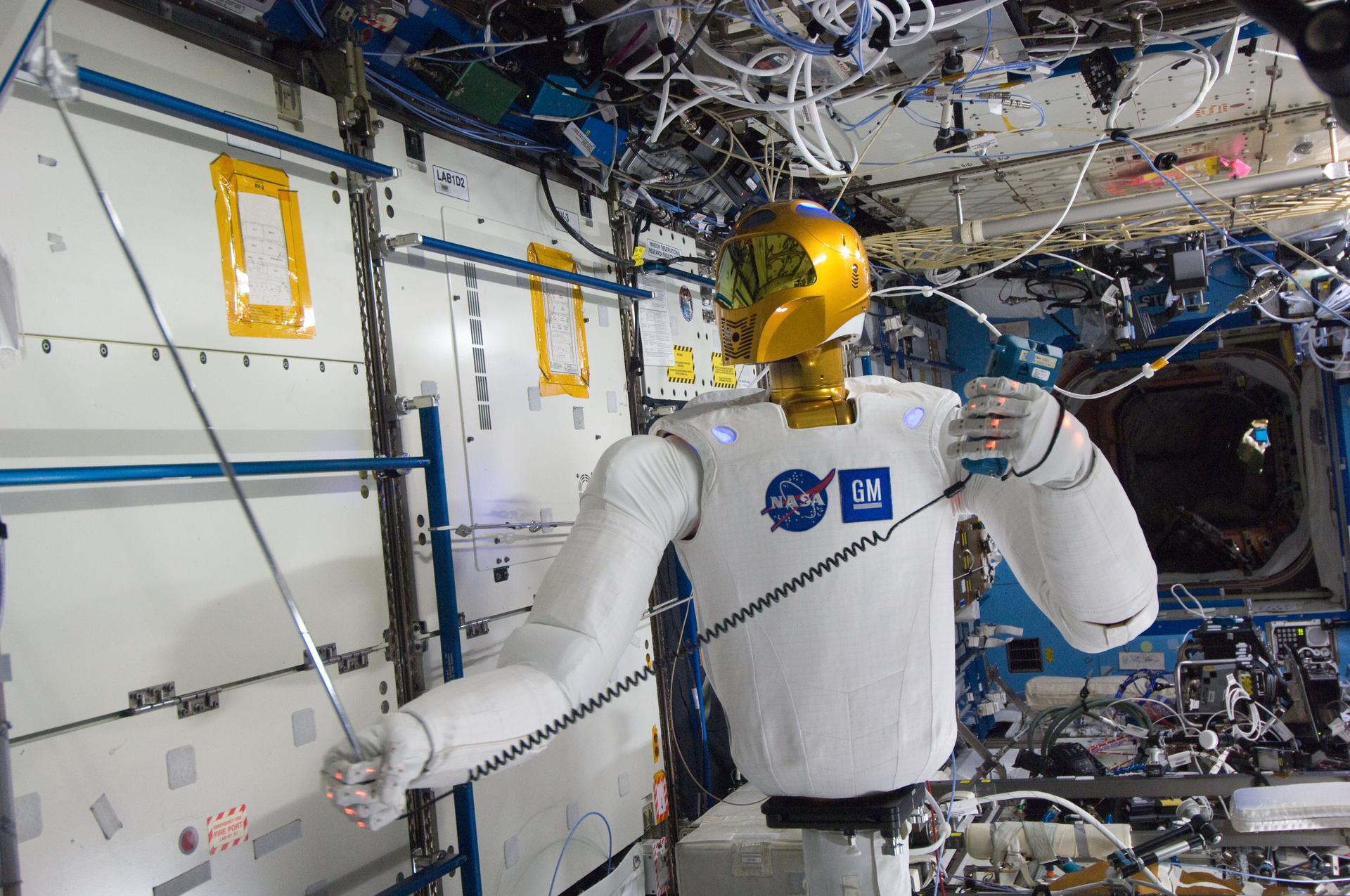 ISS030-E-177178 (14 March 2012) --- Robonaut 2 – the first dexterous humanoid robot in space – is pictured in the Destiny laboratory of the International Space Station measuring the air flow in front of vents inside the station to ensure that none of the ventilation ductwork gets clogged or blocked.
