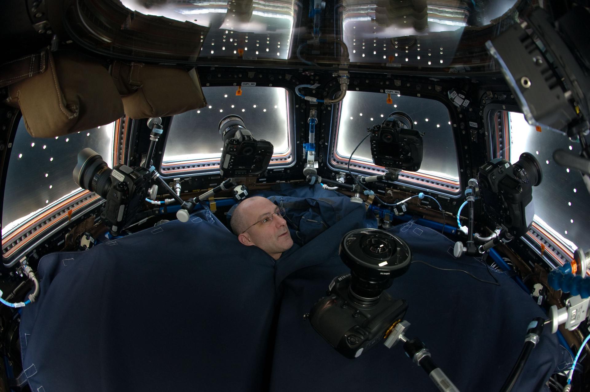 Expedition 31 flight engineer Don Pettit, with only his head visible above a shroud, is photographed in the Cupola Module. Window shutters are closed, and still cameras are positioned in front of each window