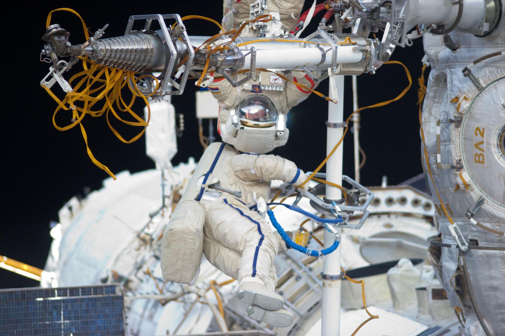 ISS032-E-021044 (20 Aug. 2012) --- Russian cosmonauts Gennady Padalka (top), Expedition 32 commander; and Yuri Malenchenko, flight engineer, participate in a session of extravehicular activity (EVA) to continue outfitting the International Space Station. During the five-hour, 51-minute spacewalk, Padalka and Malenchenko moved the Strela-2 cargo boom from the Pirs docking compartment to the Zarya module to prepare Pirs for its eventual replacement with a new Russian multipurpose laboratory module. The two spacewalking cosmonauts also installed micrometeoroid debris shields on the exterior of the Zvezda service module and deployed a small science satellite.
