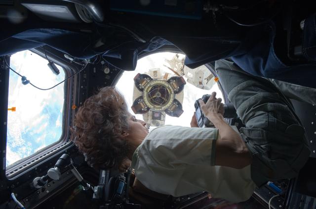 ISS033-E-012341 (16 Oct. 2012) --- NASA astronaut Sunita Williams, Expedition 33 commander, uses a still camera to photograph the Canadarm2 robotic arm?s Latching End Effector (LEE) from a window in the Cupola of the International Space Station.