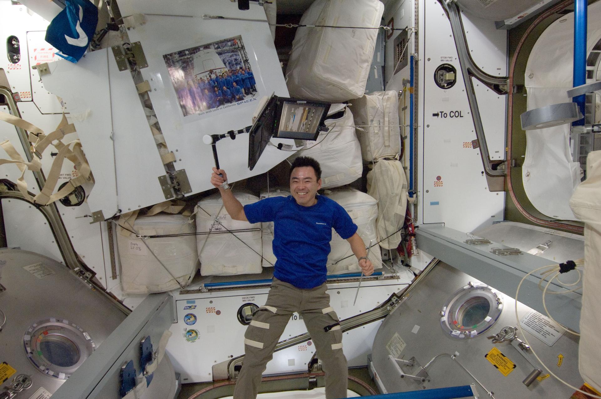 ISS033-E-013091 (14 Oct. 2012) --- Japan Aerospace Exploration Agency astronaut Aki Hoshide, Expedition 33 flight engineer, holds a computer attached to a stand in the Harmony node of the International Space Station. A signed poster of SpaceX personnel floats freely at upper left.