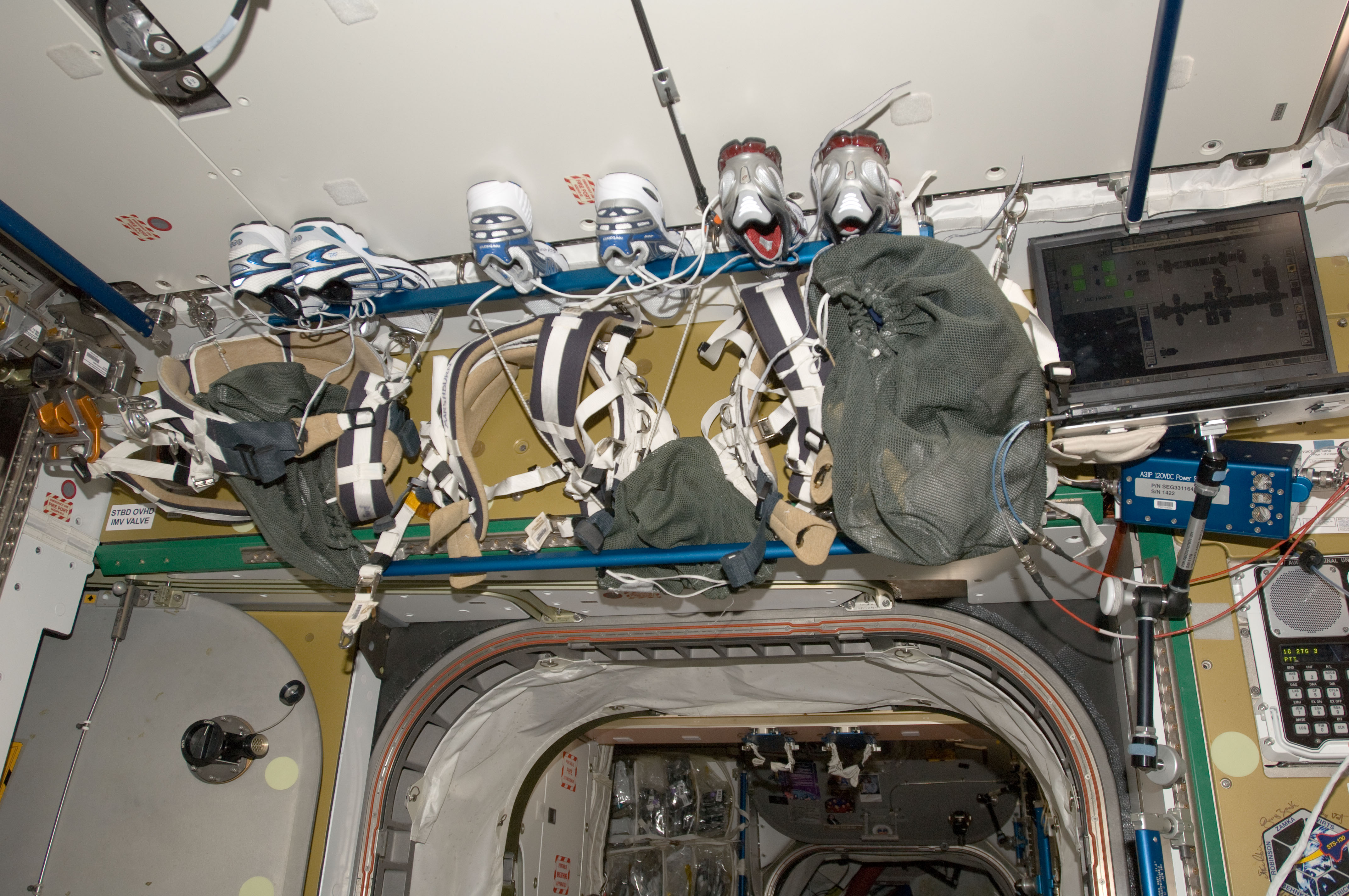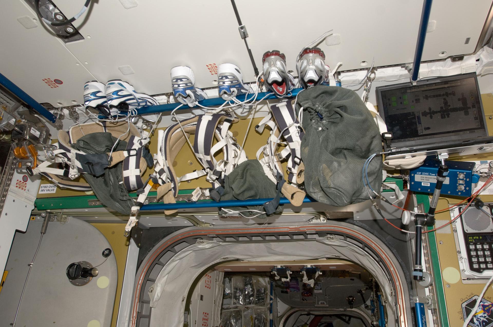 View of Avionics Rack 2 Closeout Panel with tennis shoes,in the Node 3. Photo was taken during Expedition 34.