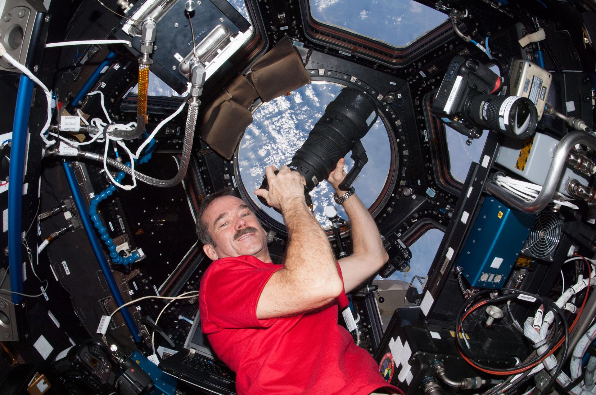 View of Canadian Space Agency (CSA) Chris Hadfield,Expedition 34 Flight Engineer (FE),using still camera,in the Cupola Module. Photo was taken during Expedition 34.