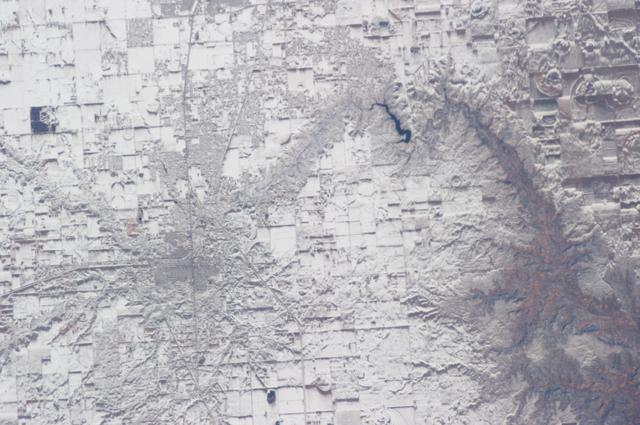 ISS034-E-057550 (28 Feb. 2013) --- One of the Expedition 34 crew members aboard the Earth-orbiting International Space Station photographed this image featuring the Southern High Plains of northwestern Texas, directly south of the city of Amarillo (off the image to the north). At first glance the picture appears more like a map than an actual photo. The winter of 2012-2013 has been marked by powerful snowstorms with record-setting snowfall throughout much of the Midwestern United States The snowstorm that passed through this area left a record snowfall of approximately 43 centimeters (17 inches). Snow blankets the city of Canyon, Texas. Urban street grids and stream channels appear etched into the landscape by the snow, a result of both melting and street clearing in the urban regions and of the incised nature of stream channels in the surrounding plains. Agricultural fields are easily identified due to the even snow cover broken only by roadways between the fields. Palo Duro Canyon is largely free of snow along the Prairie Dog Town Fork of the Red River channel and at lower elevations, allowing the red sedimentary rocks of the canyon walls to be visible. Lake Tanglewood, a reservoir to the northeast of Canyon, appears dark due to a lack of ice cover. Another dark region to the northwest of Canyon is a feed yard for cattle; any snowfall in this area has been removed by the actions of the livestock. The image was recorded with a digital camera using a 400 millimeter lens,