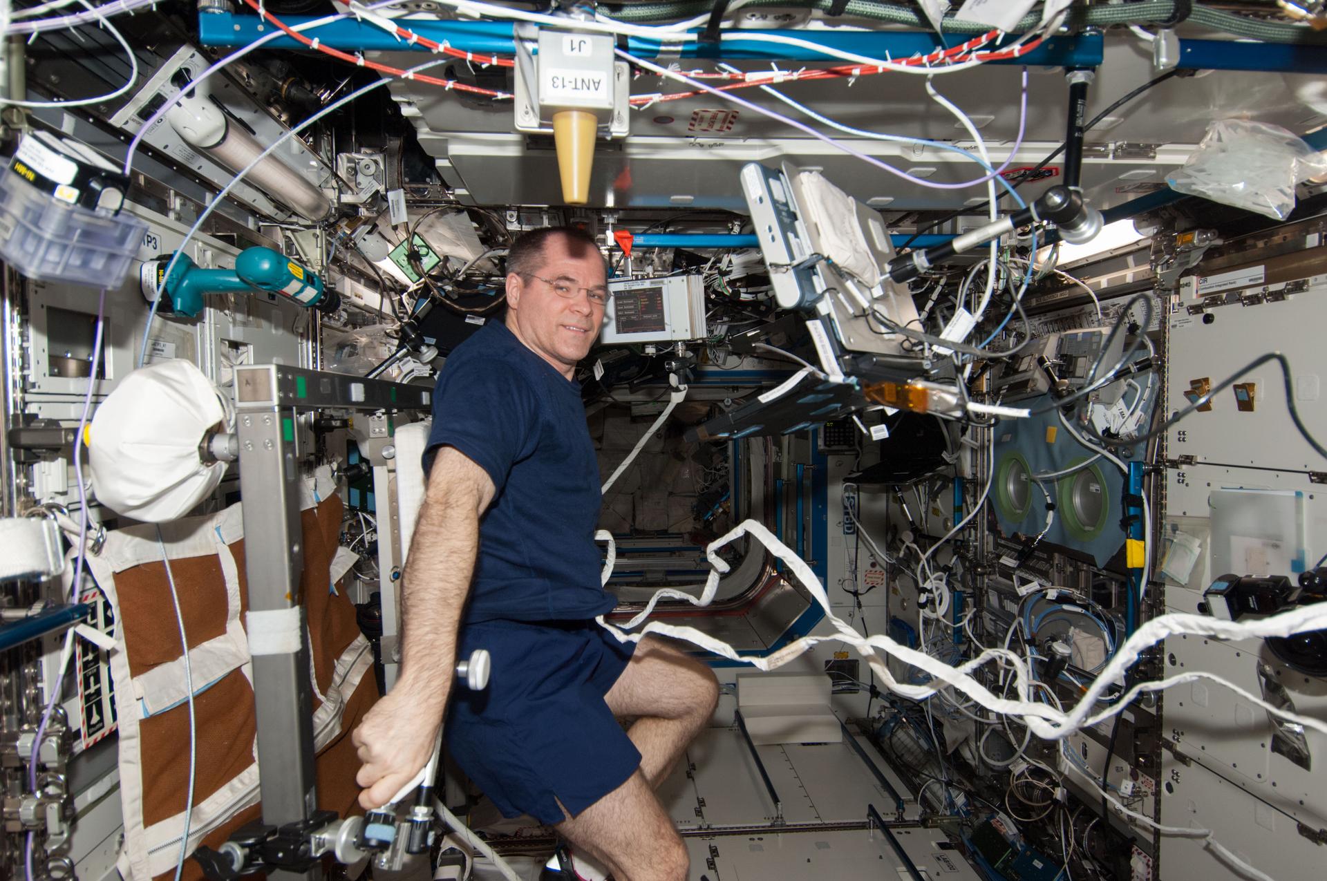ISS034-E-061648 (4 March 2013) --- Inside the U.S. lab Destiny on the Earth-orbiting International Space Station, Expedition 34 Commander Kevin Ford exercises on the Cycle Ergometer with Vibration Isolation System (CEVIS).