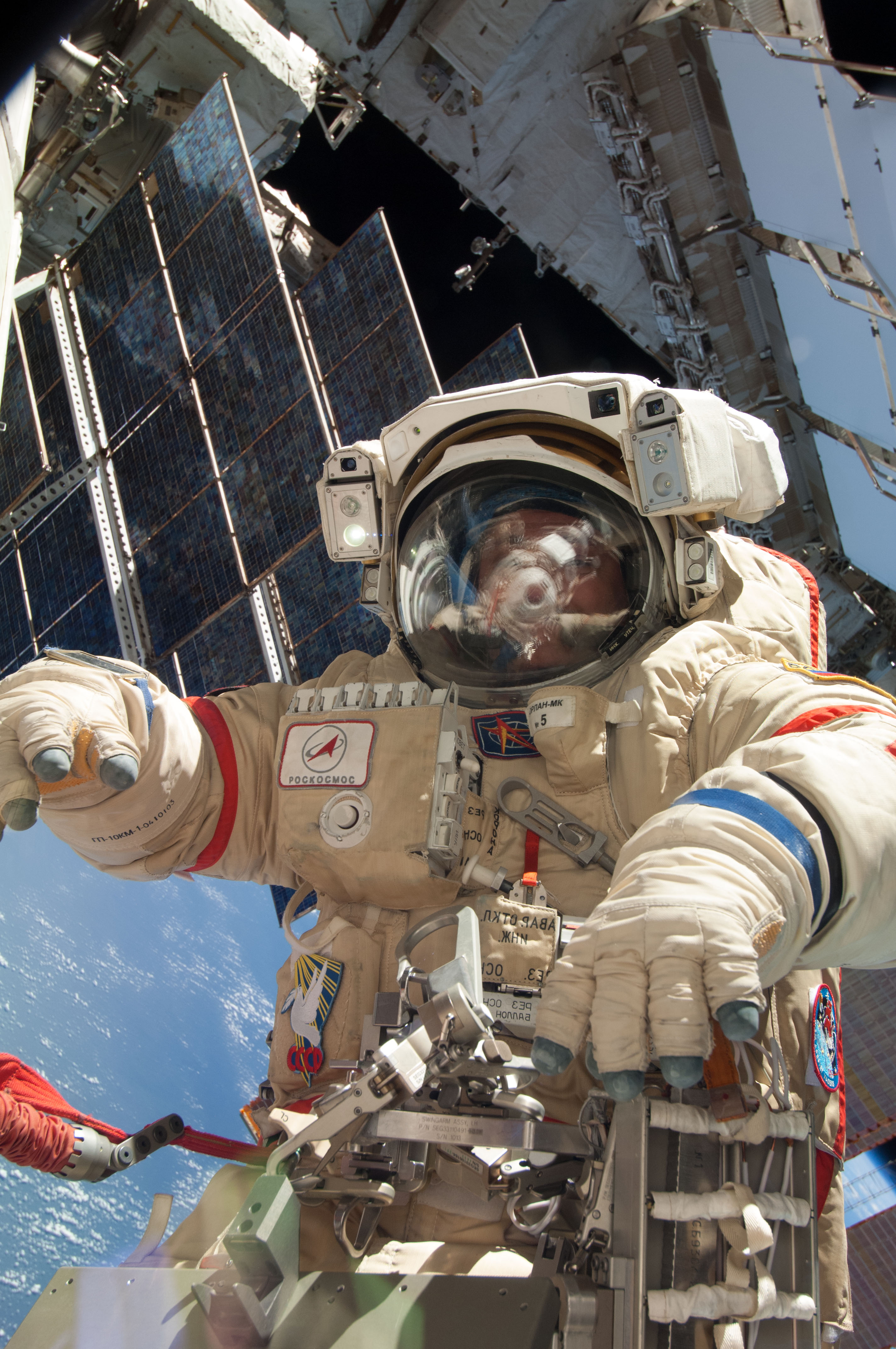 ISS036-E-011479 (24 June 2013) --- Russian cosmonaut Fyodor Yurchikhin, Expedition 36 flight engineer, participates in a session of extravehicular activity (EVA) as work continues on the International Space Station. During the six-hour, 34-minute spacewalk, Yurchikhin and Russian cosmonaut Alexander Misurkin (out of frame), Expedition 36 flight engineer, replaced an aging fluid flow control panel on the station's Zarya module as preventative maintenance on the cooling system for the Russian segment of the station. They also installed clamps for future power cables as an early step toward swapping the Pirs airlock with a new multipurpose laboratory module. The Russian Federal Space Agency plans to launch a combination research facility, airlock and docking port late this year on a Proton rocket. Yurchikhin and Misurkin also retrieved two science experiments and installed a new one.