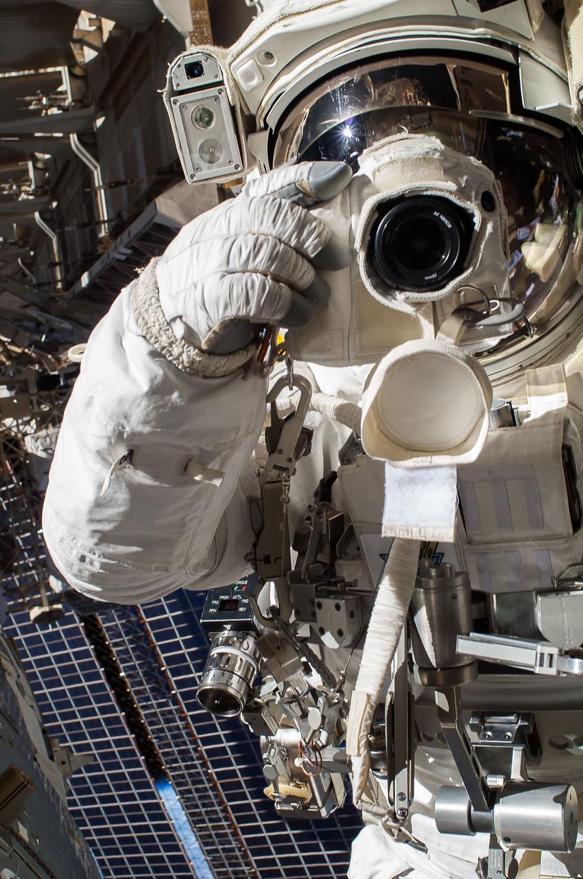 ISS036-E-019660 (16 July 2013) --- NASA astronaut Chris Cassidy, Expedition 36 flight engineer, uses a digital still camera during a session of extravehicular activity (EVA) as work continues on the International Space Station. A little more than one hour into the spacewalk, European Space Agency astronaut Luca Parmitano (out of frame) reported water floating behind his head inside his helmet. The water was not an immediate health hazard for Parmitano, but Mission Control decided to end the spacewalk early.