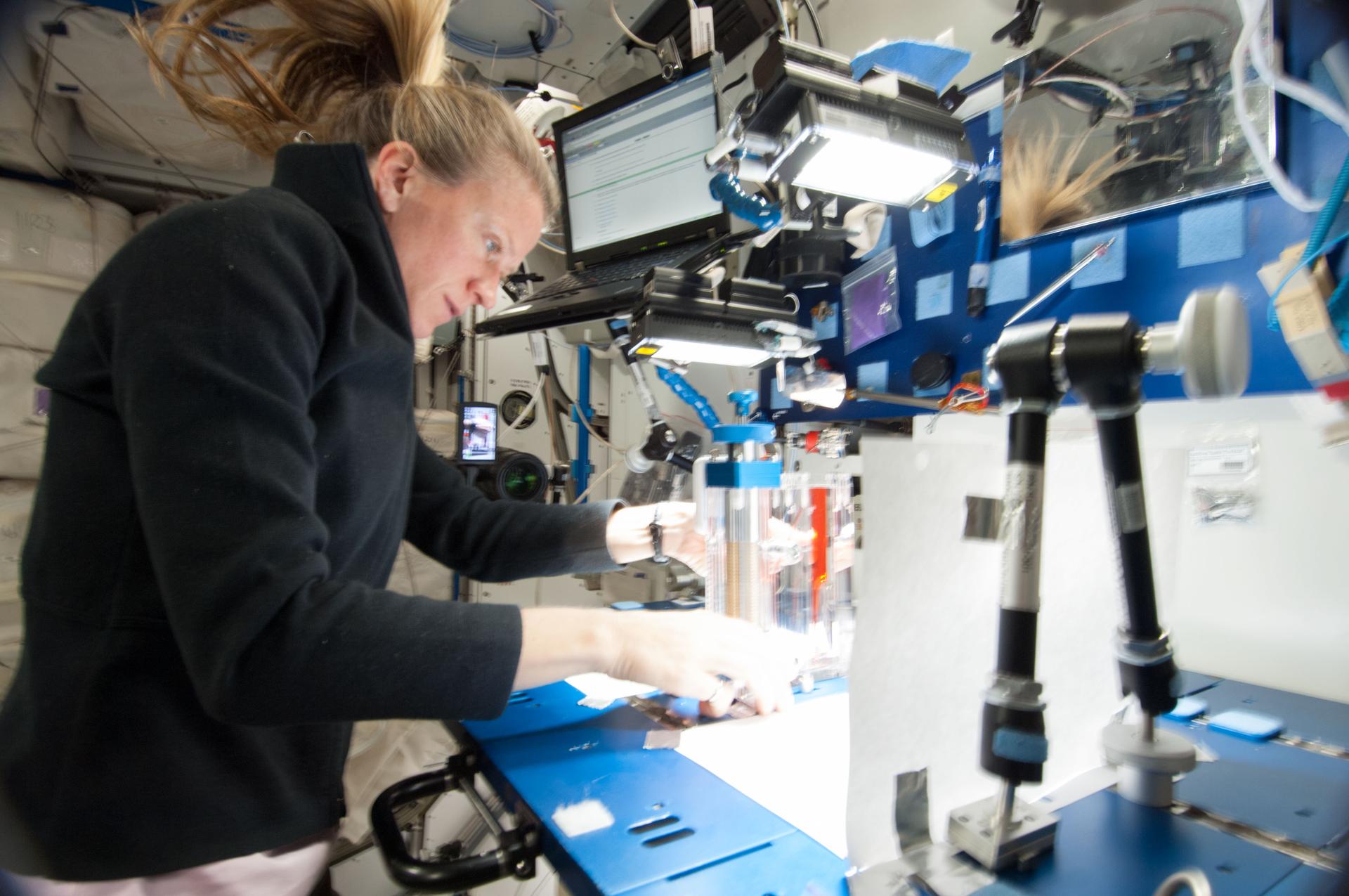ISS036-E-029767 (8 Aug. 2013) --- NASA astronaut Karen Nyberg, Expedition 36 flight engineer, conducts a session with the Capillary Flow Experiment (CFE) in the Harmony node of the International Space Station. CFE observes the flow of fluid, in particular capillary phenomena, in microgravity. The data from this experiment will improve computer models used to design fluid transfer systems and fuel tanks on future spacecraft.