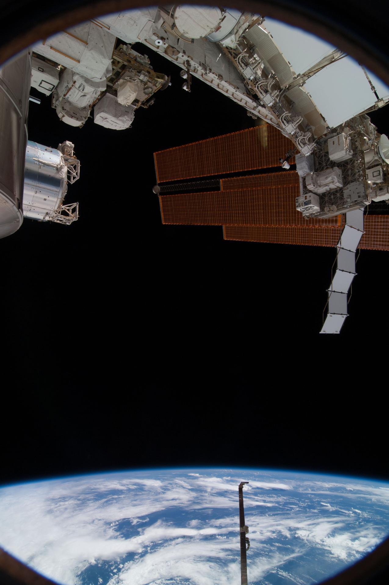 View of antenna and solar arrays (with an Earth limb in the background) taken from a window in the Russian Soyuz spacecraft currently docked to the International Space Station. Photo taken by an Expedition 36 crewmember. Per Twitter message: View out the window to the right of my seat in Soyuz while docked to ISS.