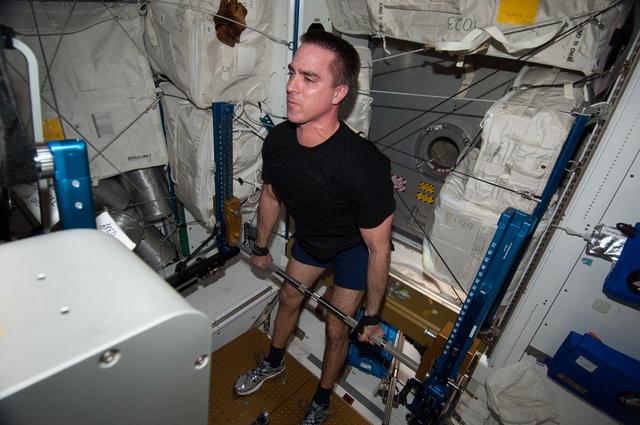 ISS036-E-038720 (31 Aug. 2013) --- NASA astronaut Chris Cassidy, Expedition 36 flight engineer, gets a workout on the advanced Resistive Exercise Device (aRED) in the Tranquility node of the International Space Station.