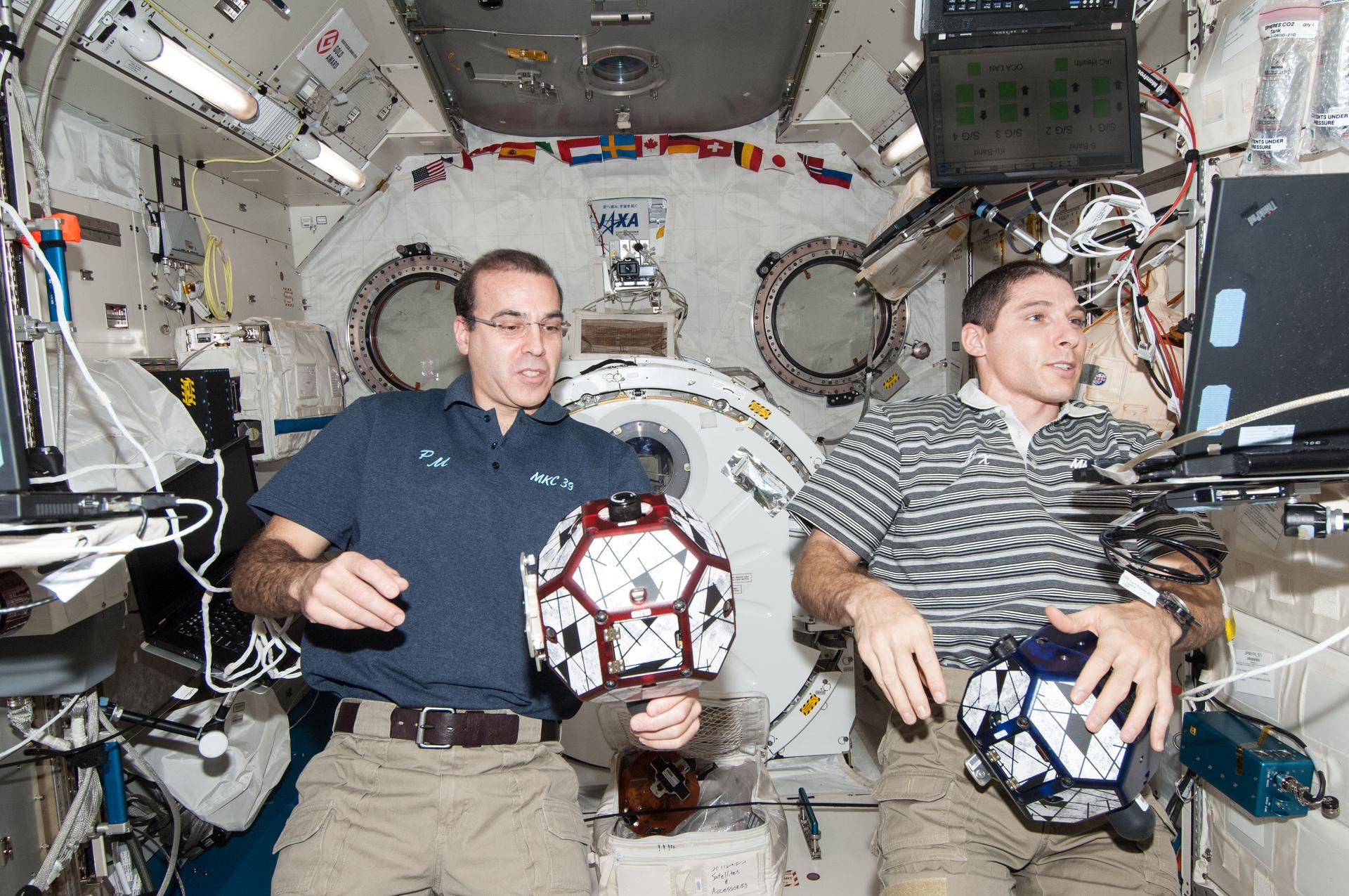 ISS038-E-014012 (9 Dec. 2013) --- In the International Space Station's Kibo laboratory, NASA astronauts Rick Mastracchio (left) and Michael Hopkins, both Expedition 38 flight engineers, conduct a session with a pair of bowling-ball-sized free-flying satellites known as Synchronized Position Hold, Engage, Reorient, Experimental Satellites, or SPHERES.