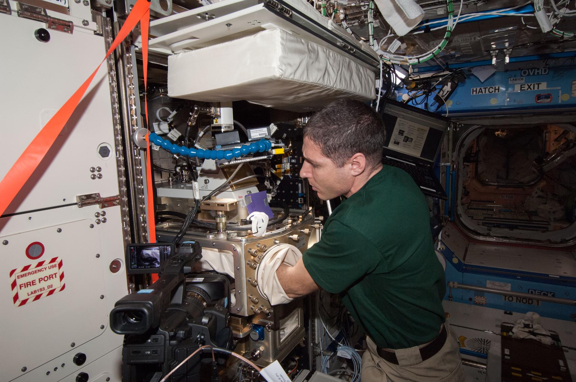 ISS038-E-055240 (24 Feb. 2014) --- In the International Space Station's Destiny laboratory, NASA astronaut Mike Hopkins, Expedition 38 flight engineer, sets up the Advanced Colloids Experiment (ACE) housed in the Light Microscopy Module (LMM) inside the Fluids Integrated Rack. ACE studies microscopic particles suspended in a liquid.