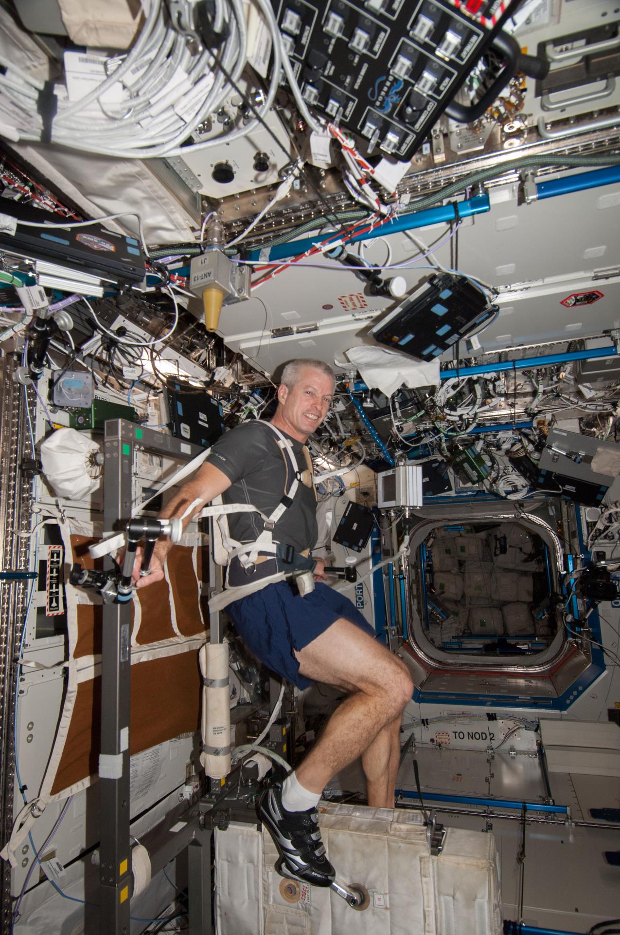 ISS039-E-014696 (22 April 2014) --- Expedition 39 Flight Engineer Steve Swanson of NASA, works out on the Cycle Ergometer with Vibration Isolation System (CEVIS) in the U.S. lab Destiny of the International Space Station.