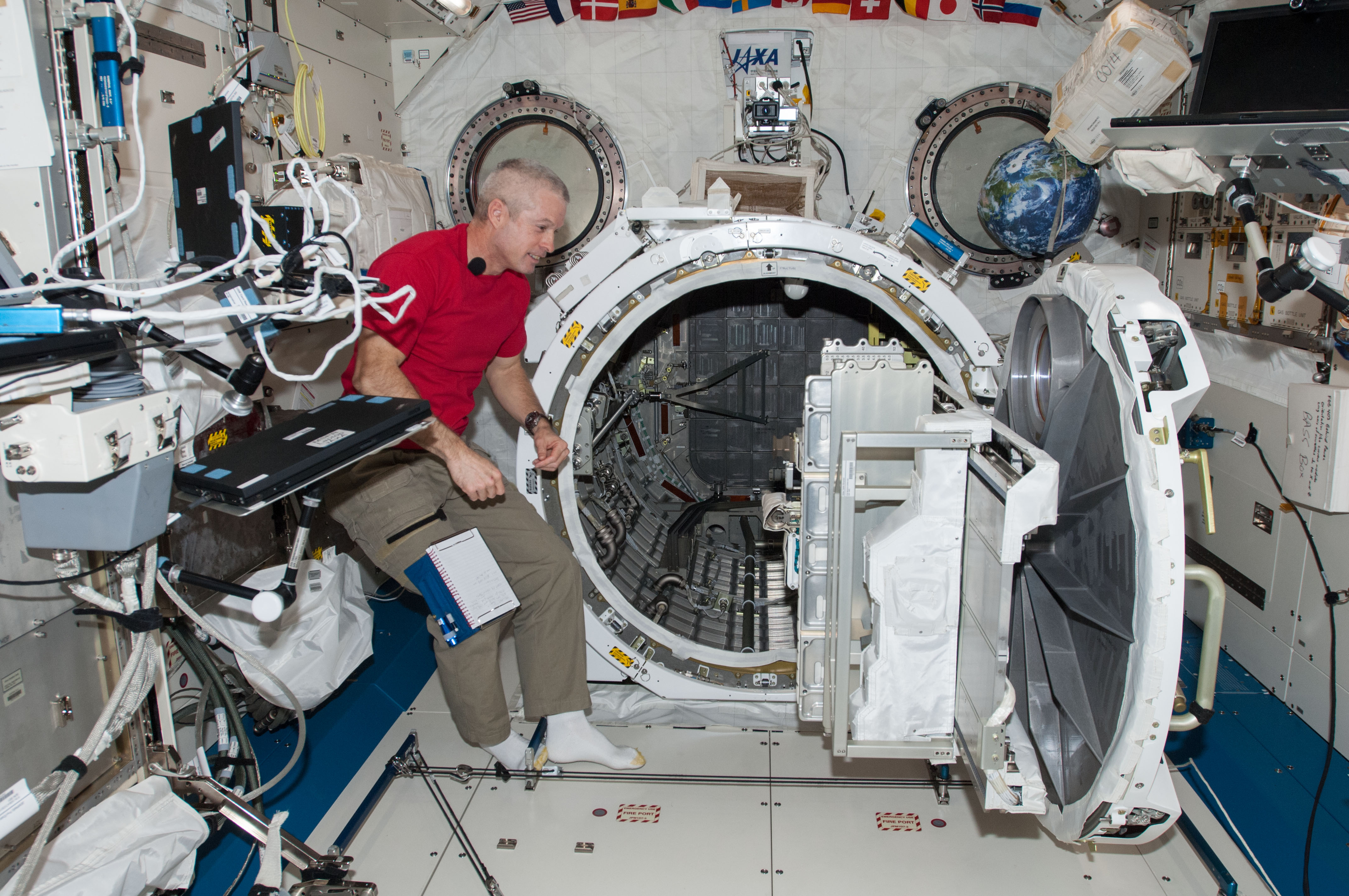 ISS040-E-001051 (26 May 2014) --- NASA astronaut Steve Swanson, Expedition 40 commander, works with equipment in the airlock in the Kibo laboratory of the International Space Station. The JEM Robotic Maneuvering System Multi-Purpose Experiment Platform (JEMRMS MPEP) is visible at right.