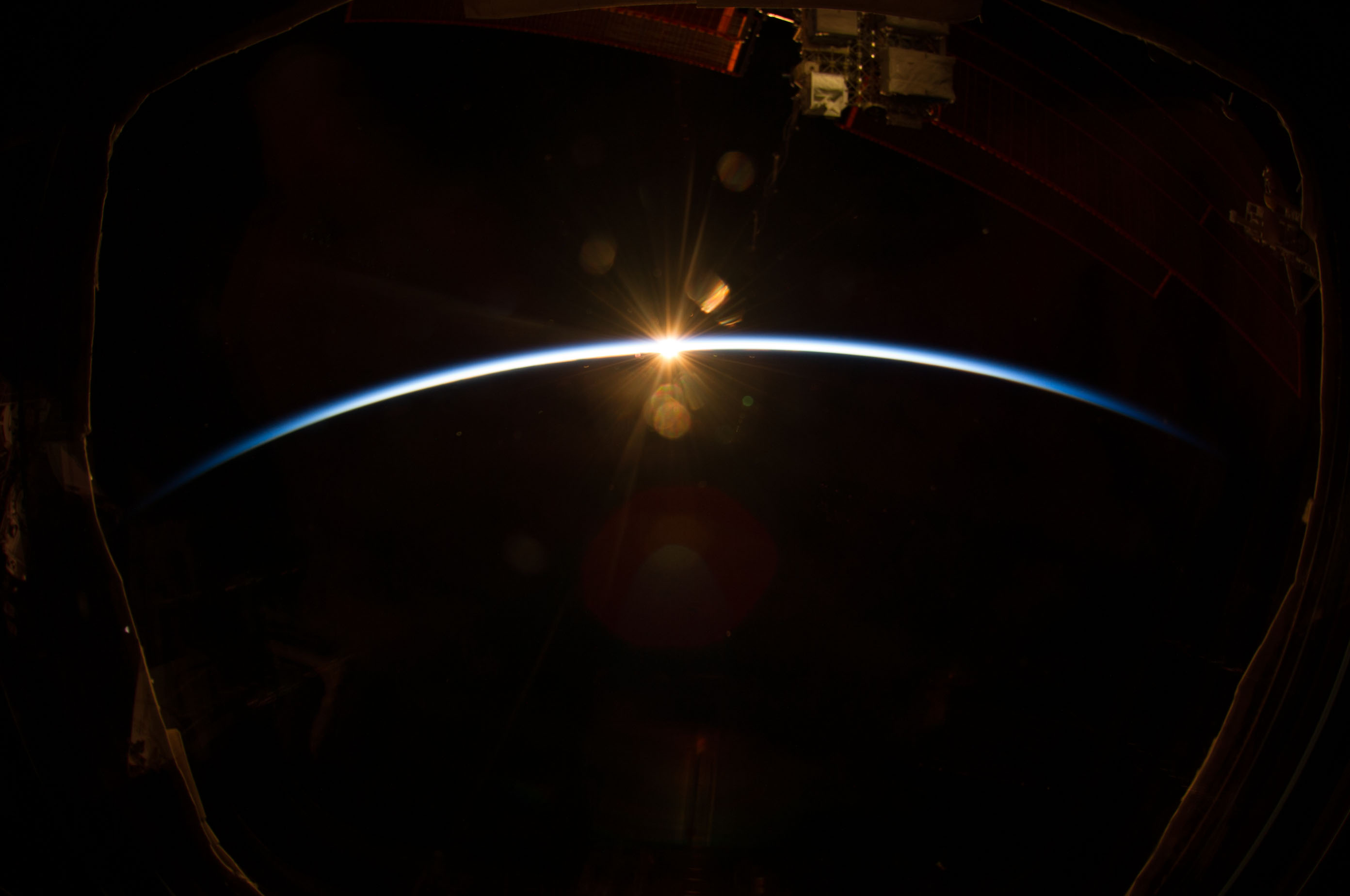 ISS040-E-008169 (7 June 2014) --- The sun, peeking through the thin line of Earth’s atmosphere, is featured in this image photographed by an Expedition 40 crew member on the International Space Station. Crew members onboard the space station see, on average, sixteen sunrises and sunsets during a 24-hour orbital period.