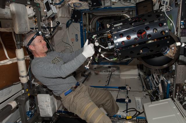 ISS040-E-010502 (11 June 2014) --- NASA astronaut Steve Swanson, Expedition 40 commander, works with the Multi-user Drop Combustion Apparatus (MDCA) inside the Combustion Integrated Rack (CIR) in the Destiny laboratory of the International Space Station. The MDCA contains hardware and software to conduct unique droplet combustion experiments in space.