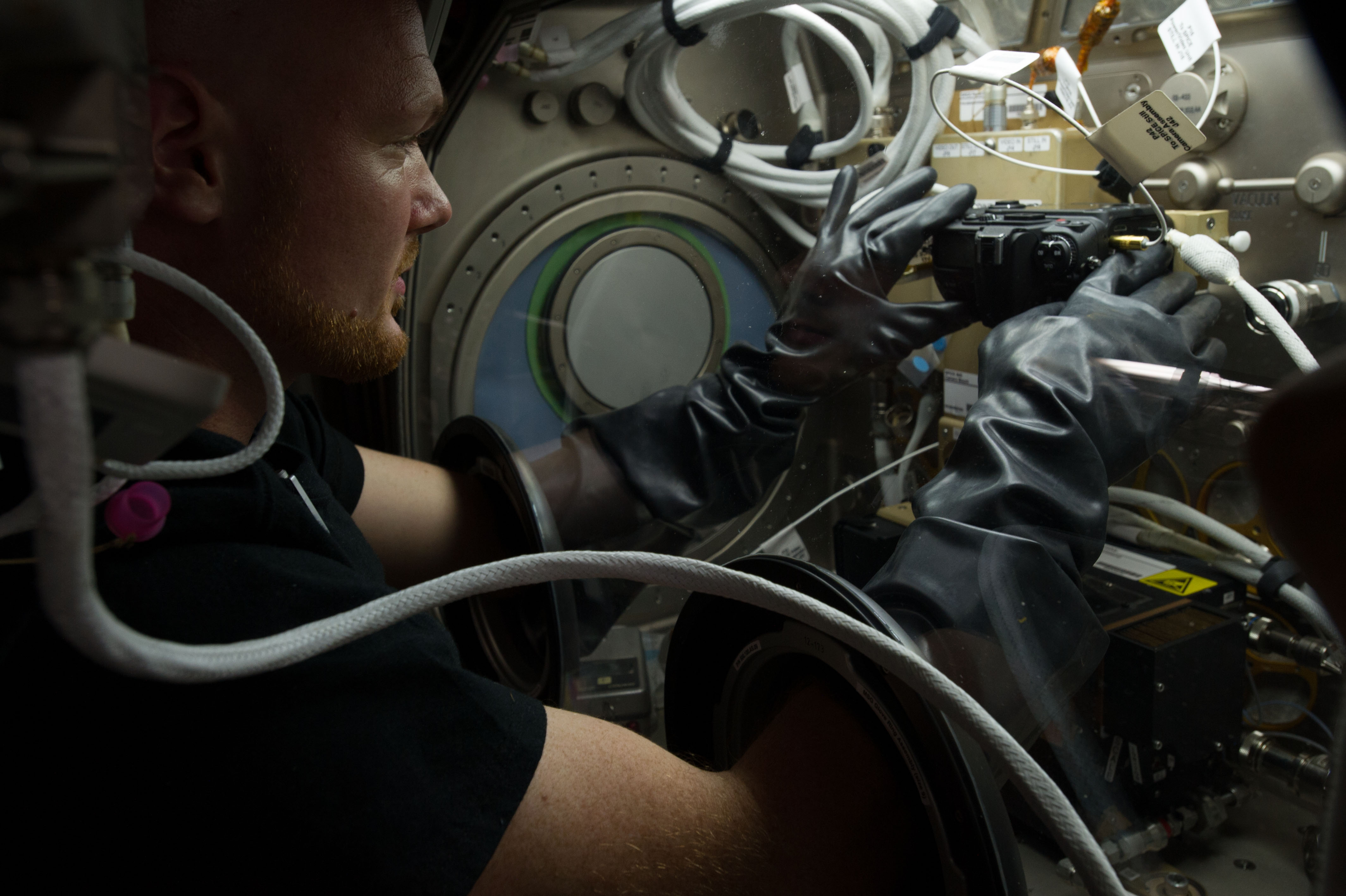 ISS040-E-012309 (16 June 2014) --- European Space Agency astronaut Alexander Gerst, Expedition 40 flight engineer, conducts two flame tests for a combustion experiment known as the Burning and Suppression of Solids (BASS) in the Microgravity Science Glovebox (MSG) in the Destiny laboratory of the International Space Station. The experiment seeks to provide insight on how flames burn in space compared to Earth which may provide fire safety benefits aboard future spacecraft.