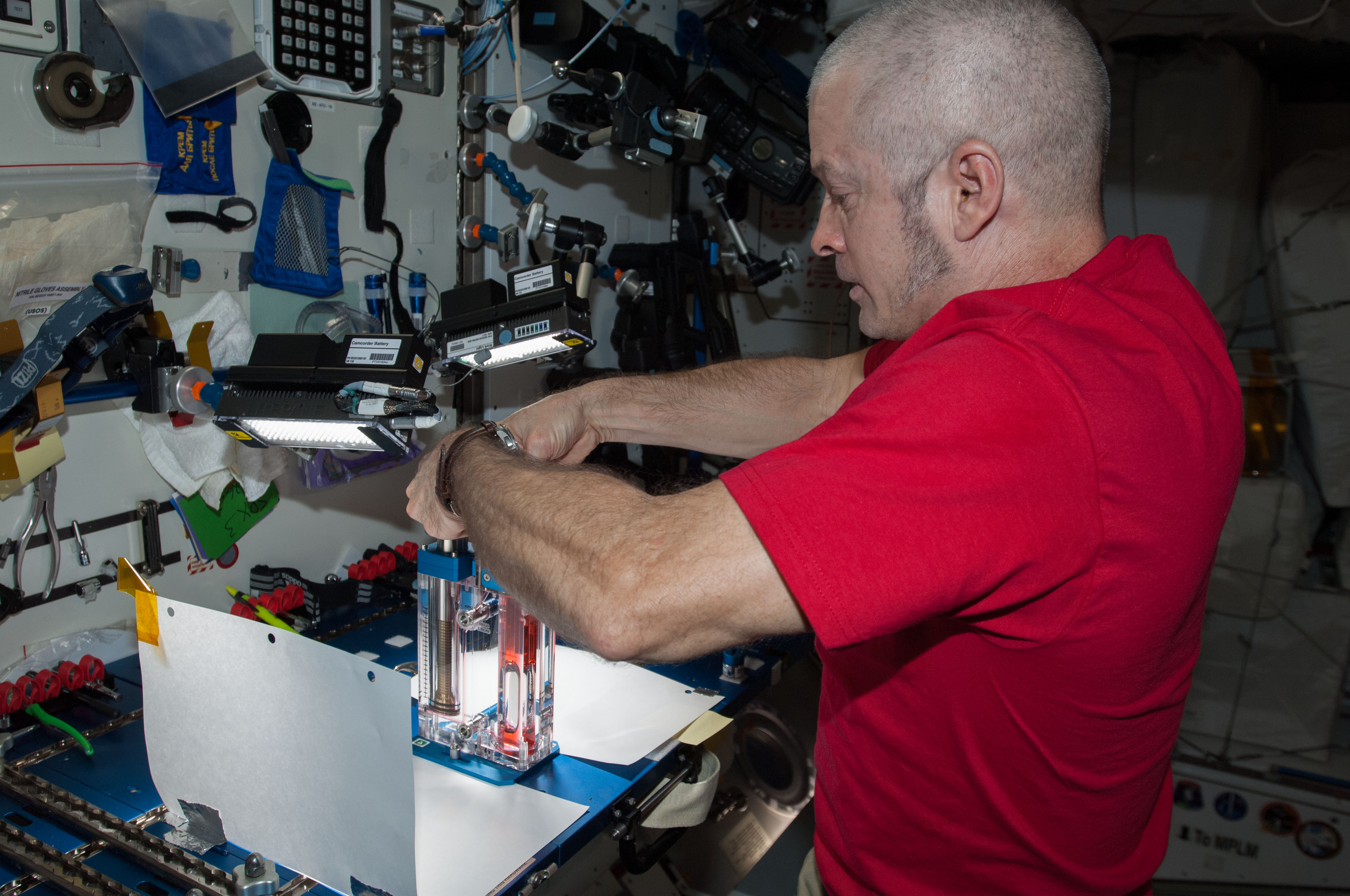 ISS040-E-032820 (3 July 2014) --- NASA astronaut Steve Swanson, Expedition 40 commander, conducts a session with the Capillary Flow Experiment (CFE) in the Harmony node of the International Space Station. CFE is a suite of fluid physics experiments that investigate how fluids move up surfaces in microgravity. The results aim to improve current computer models that are used by designers of low gravity fluid systems and may improve fluid transfer systems for water on future spacecraft.
