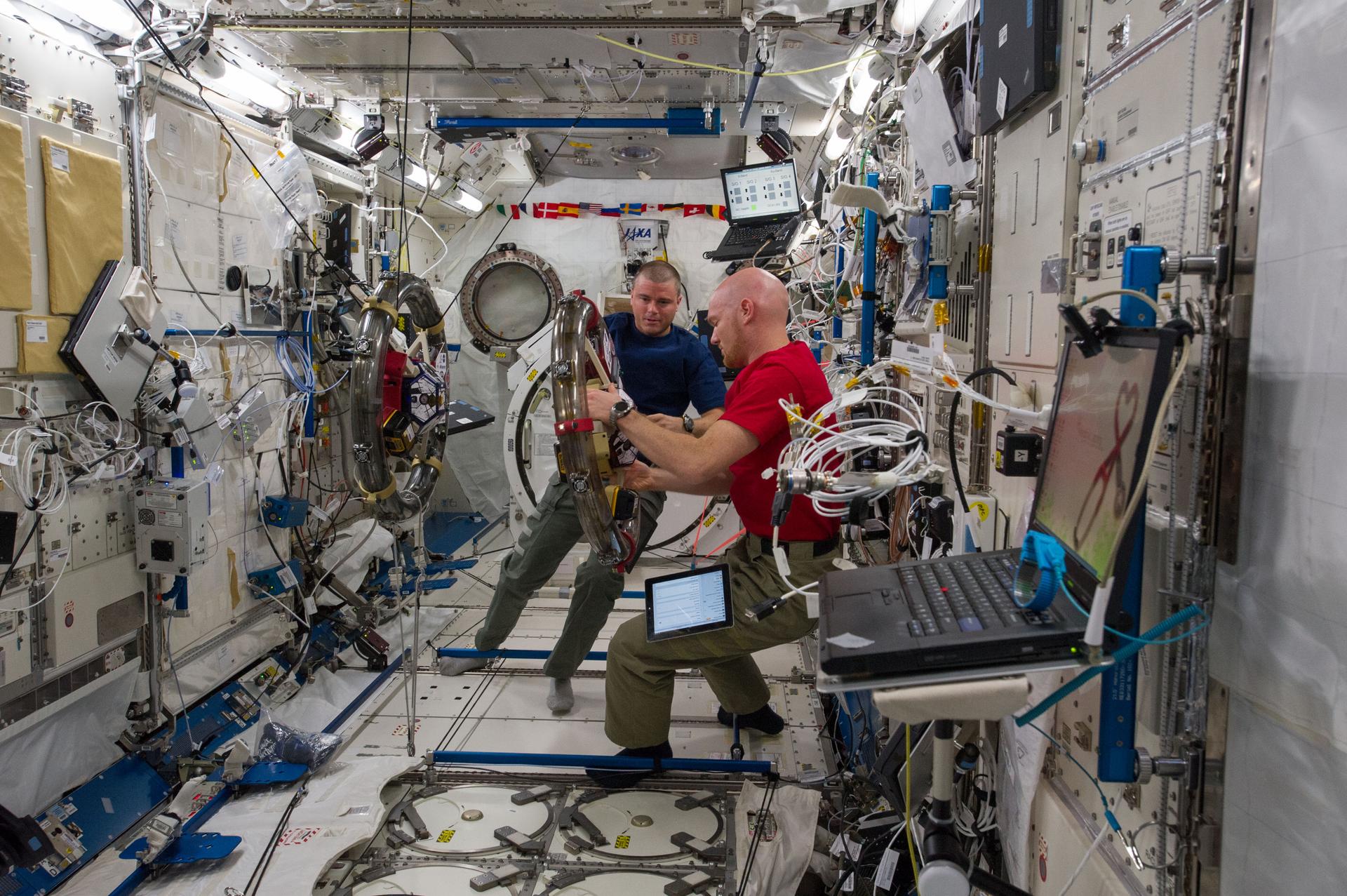ISS040-E-059344 (10 July 2014) --- In the International Space Station’s Kibo laboratory, NASA astronaut Reid Wiseman (left) and European Space Agency astronaut Alexander Gerst, both Expedition 40 flight engineers, conduct a session with a pair of bowling-ball-sized free-flying satellites known as Synchronized Position Hold, Engage, Reorient, Experimental Satellites, or SPHERES. Surrounding the two SPHERES mini-satellites is ring-shaped hardware known as the Resonant Inductive Near-field Generation System, or RINGS. SPHERES-RINGS seeks to demonstrate wireless power transfer between satellites at a distance for enhanced operations.