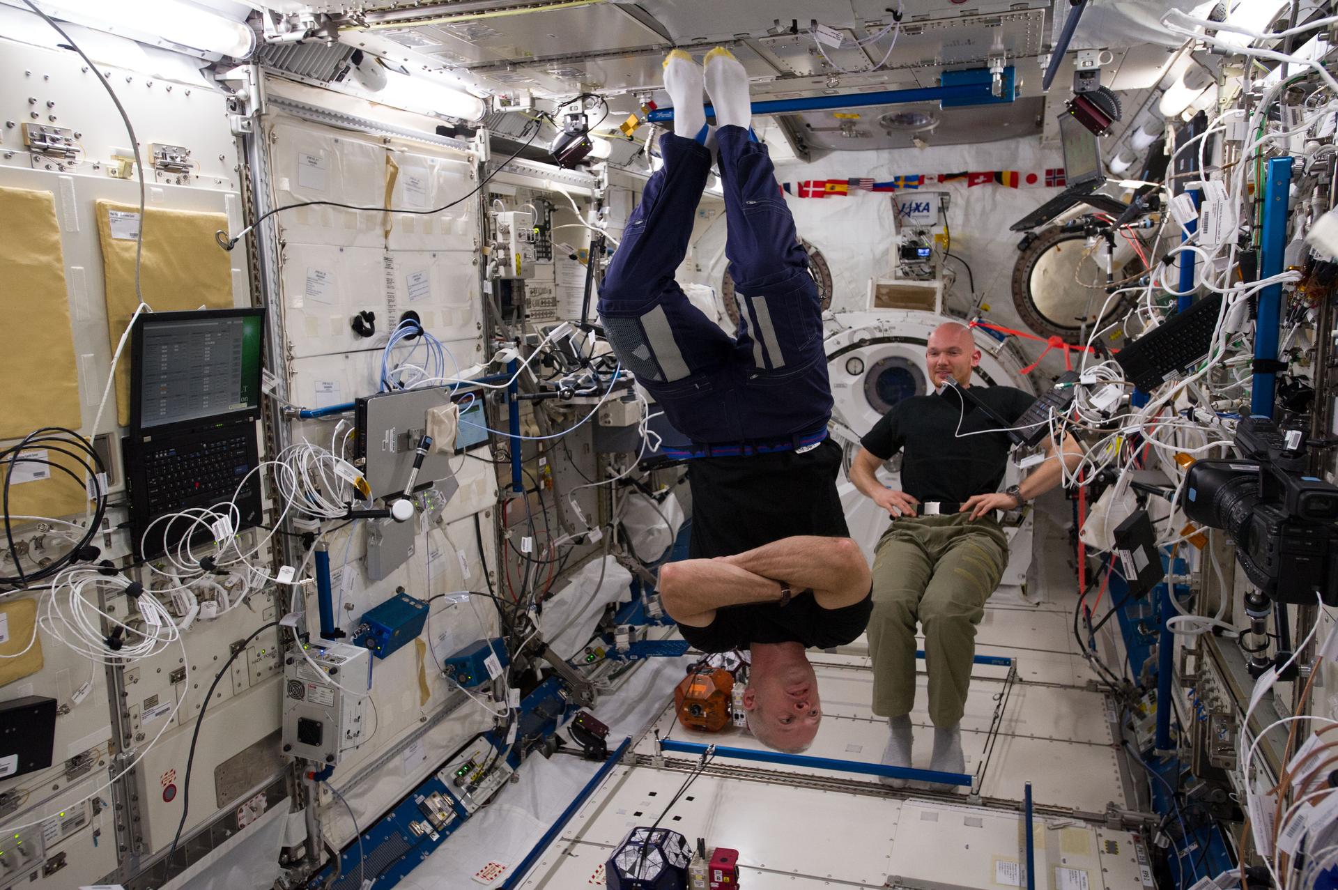 ISS040-E-079332 (25 July 2014) --- In the International Space Station?s Kibo laboratory, NASA astronaut Steve Swanson (foreground), Expedition 40 commander; and European Space Agency astronaut Alexander Gerst, flight engineer, conduct a session with a trio of soccer-ball-sized robots known as the Synchronized Position Hold, Engage, Reorient, Experimental Satellites, or SPHERES. The free-flying robots were equipped with stereoscopic goggles called the Visual Estimation and Relative Tracking for Inspection of Generic Objects, or VERTIGO, to enable the SPHERES to perform relative navigation based on a 3D model of a target object.