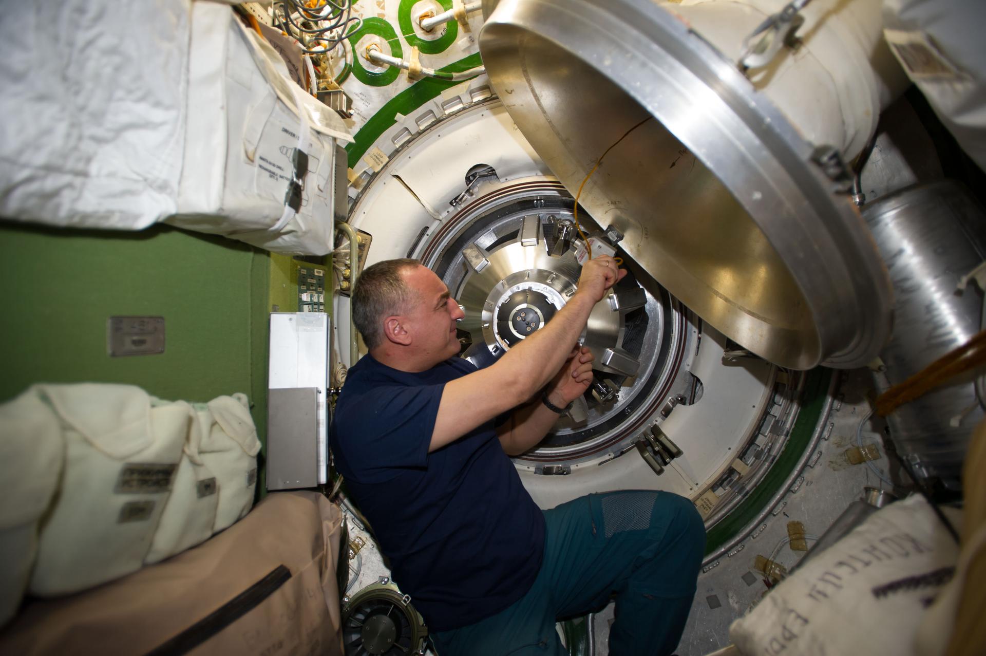 ISS040-E-091940 (13 Aug. 2014) --- Russian cosmonaut Alexander Skvortsov, Expedition 40 flight engineer, prepares to remove the docking mechanism to gain access to the hatch of the newly attached "Georges Lemaitre" Automated Transfer Vehicle-5 (ATV-5).