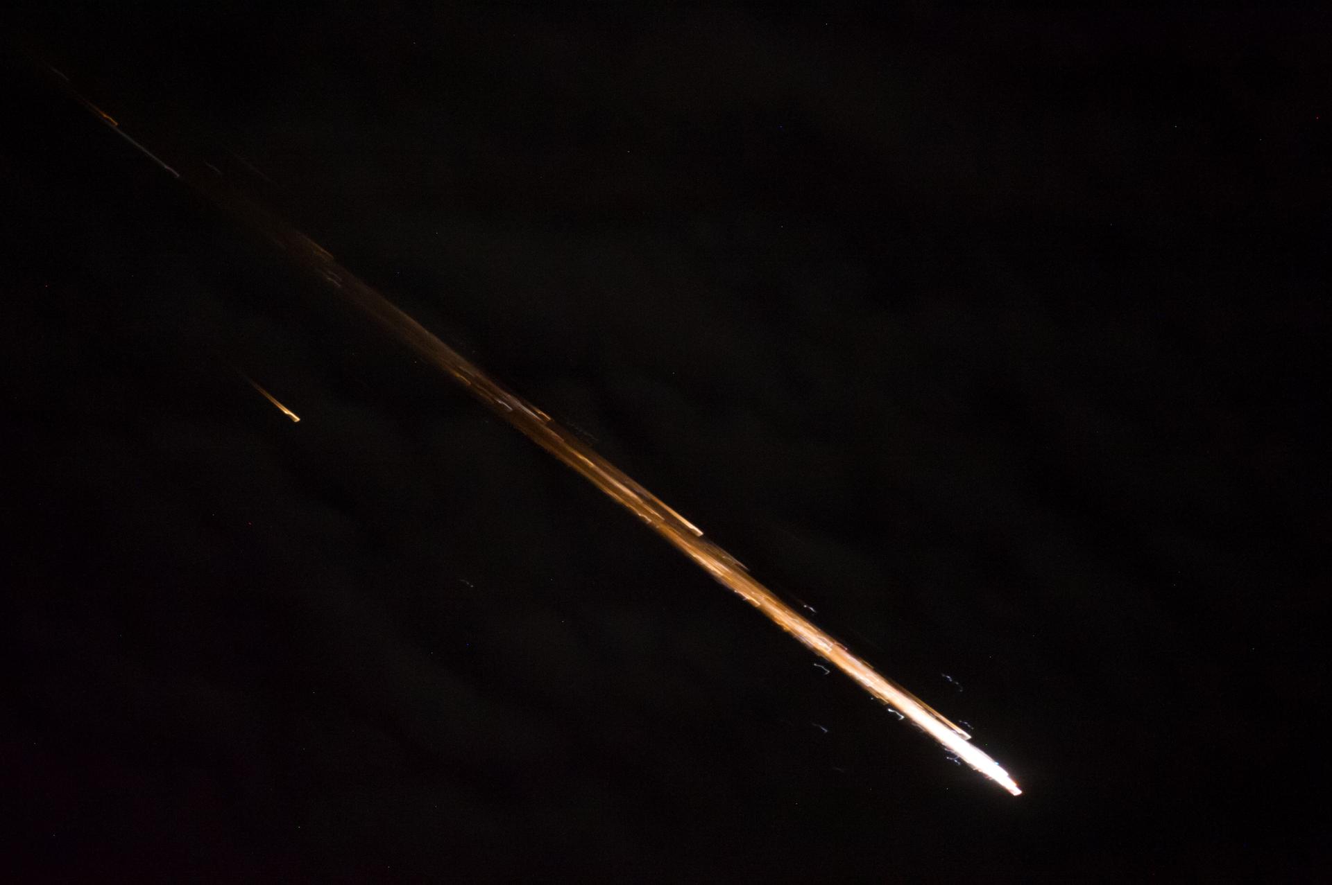 ISS040-E-098545 (17 Aug. 2014) --- One of the Expedition 40 crew members aboard the International Space Station recorded this image of the Orbital Sciences Corporation's Cygnus cargo carrier spacecraft breaking up in Earth's atmosphere after being released from the orbital outpost. The breakup started around 13:22 GMT on Aug. 17, 2014 and this photo was taken at 13:23:08 GMT.