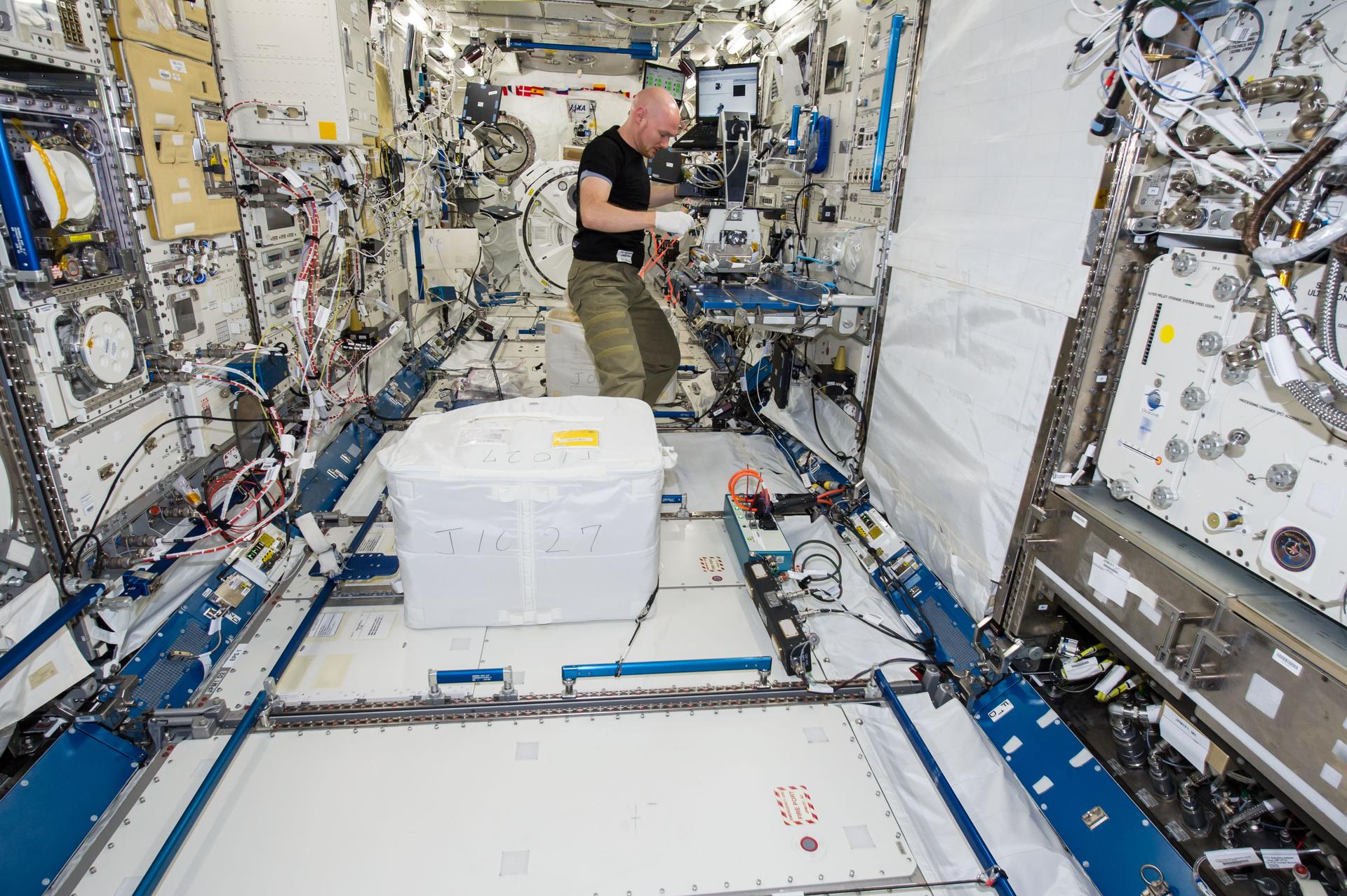 ISS040-E-130231 (9 Sept. 2014) --- European Space Agency astronaut Alexander Gerst, Expedition 40 flight engineer, installs a microscope for the Cell Mechanosensing-2 experiment in the Kibo laboratory of the International Space Station. The Japanese experiment, which is conducted in Kibo’s Kobairo rack, seeks to identify gravity sensors in cells that may change the expression of key proteins and genes and allowing muscles to atrophy in microgravity.