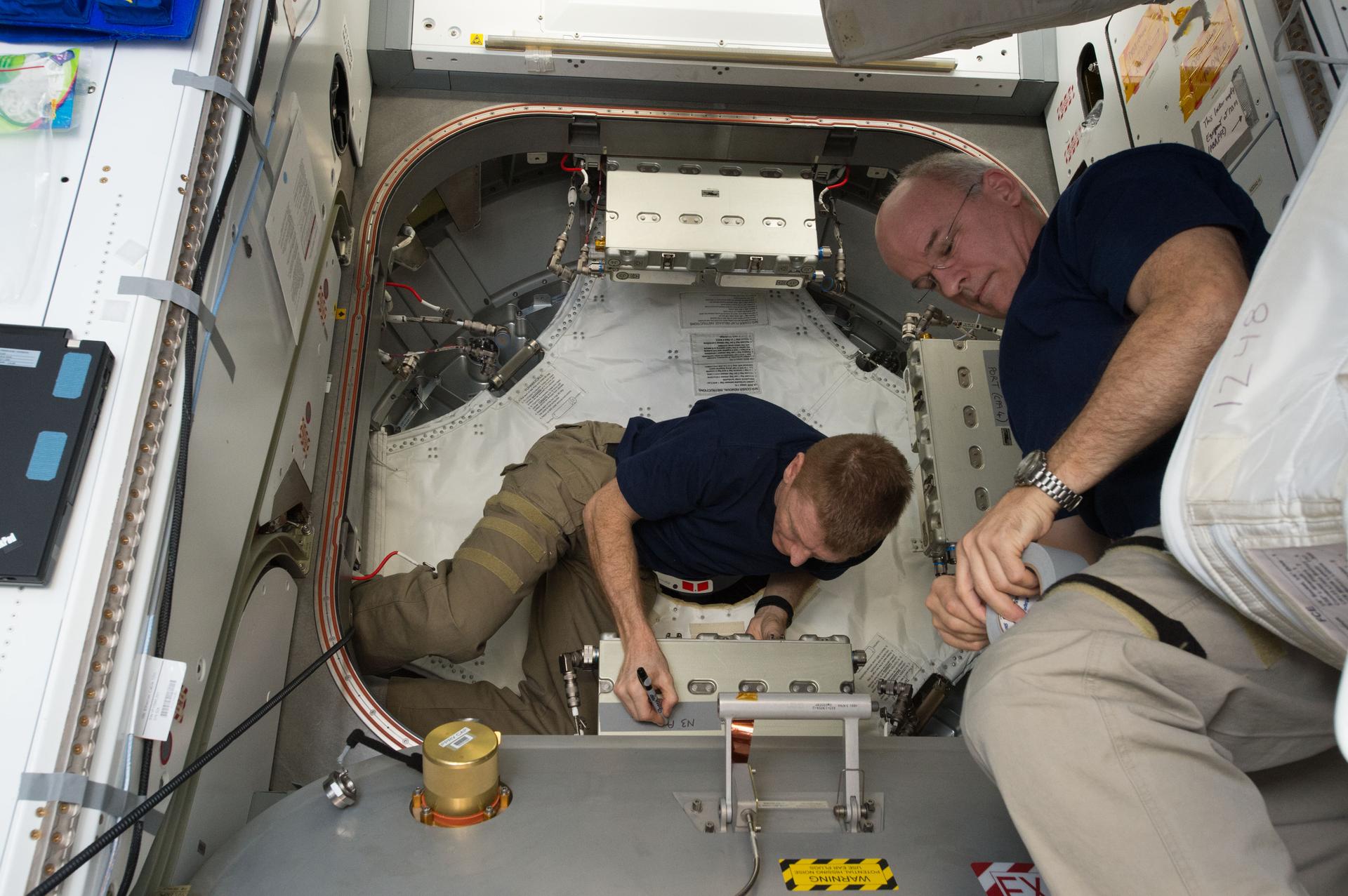 ISS047e133469 (05/25/2016) --- ESA (European Space Agency) astronaut Tim Peak (left) and NASA Astronaut Jeff Williams (right) prepare the Bigelow Expandable Activity Module (BEAM) for expansion. The pair were outfitting the area known as the vestibule, which is the space between the hatch on BEAM and hatch on Tranquility. NASA Astronaut Jeff Williams and the NASA and Bigelow Aerospace teams working at Mission Control Center at NASA’s Johnson Space Center spent more than seven hours on operations to fill the BEAM with air to cause it to expand.