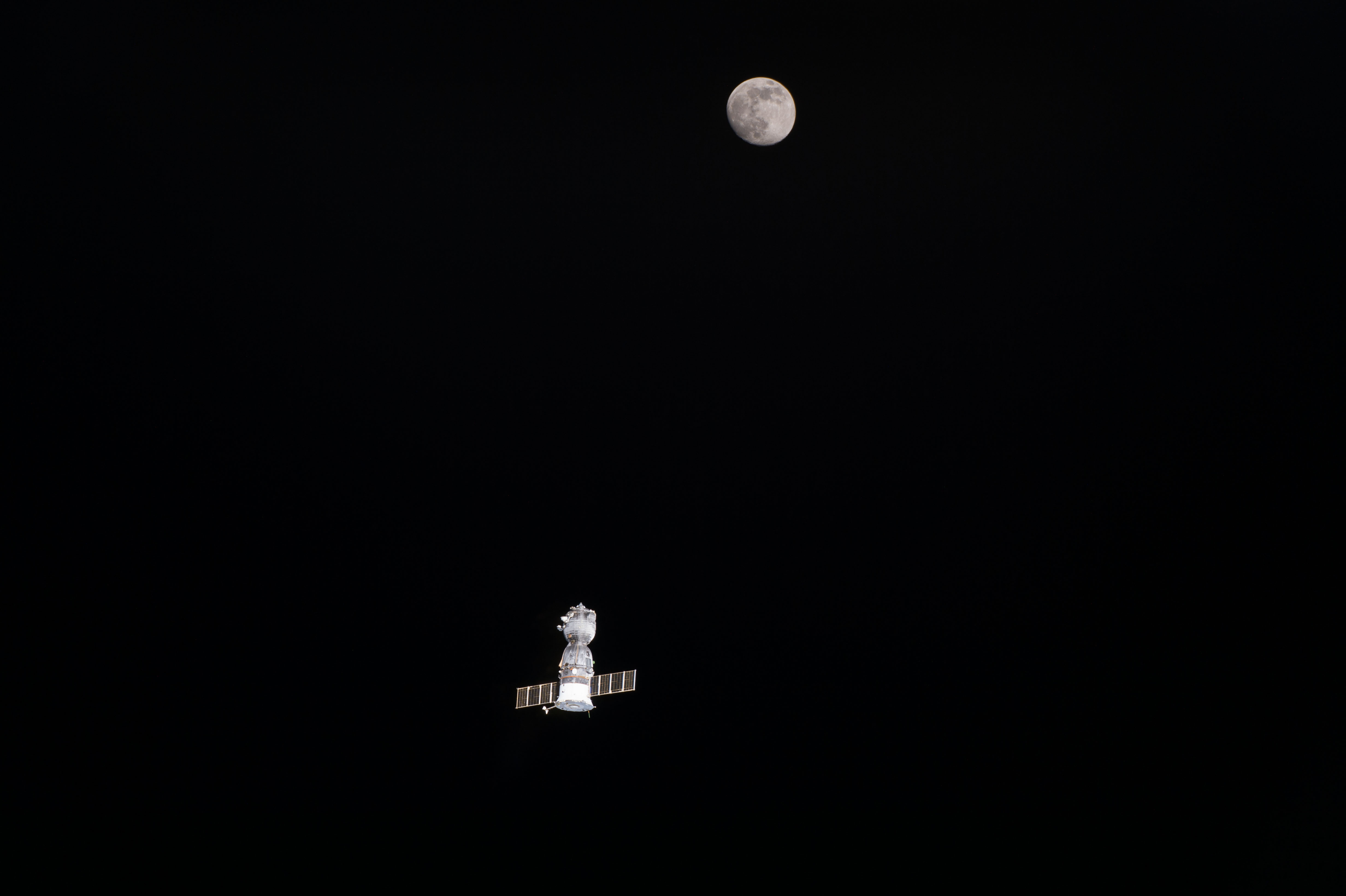 View of the departing Soyuz TMA-19M spacecraft and the nearly full Moon.