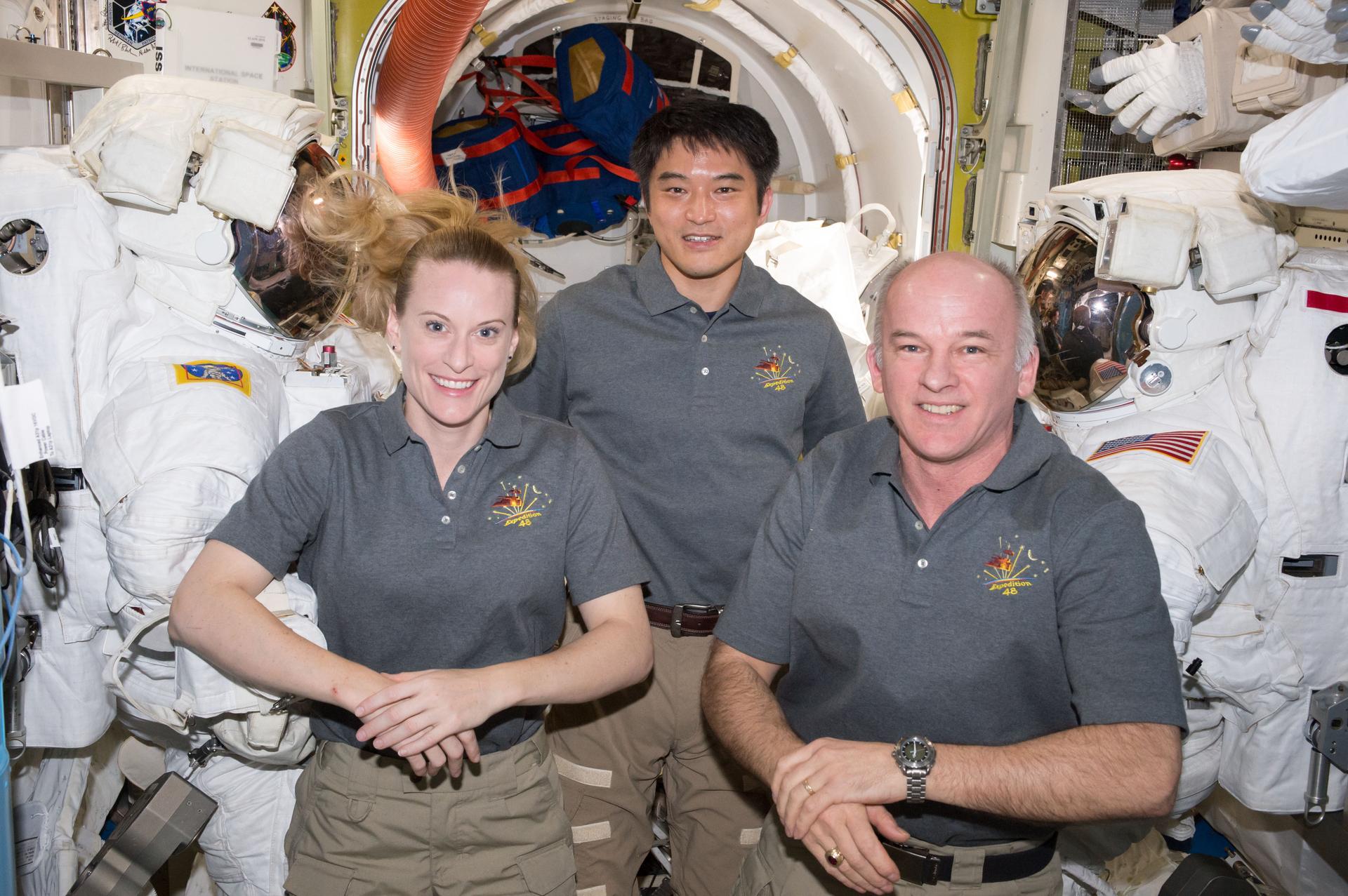 ISS048e057395 (08/14/2016) --- NASA astronauts Kate Rubins (left) and Jeff Williams (right) are joined by JAXA (Japan Aerospace Exploration Agency) astronaut Takuya Onishi inside the Quest airlock as they prepare spacesuits for upcoming spacewalks.