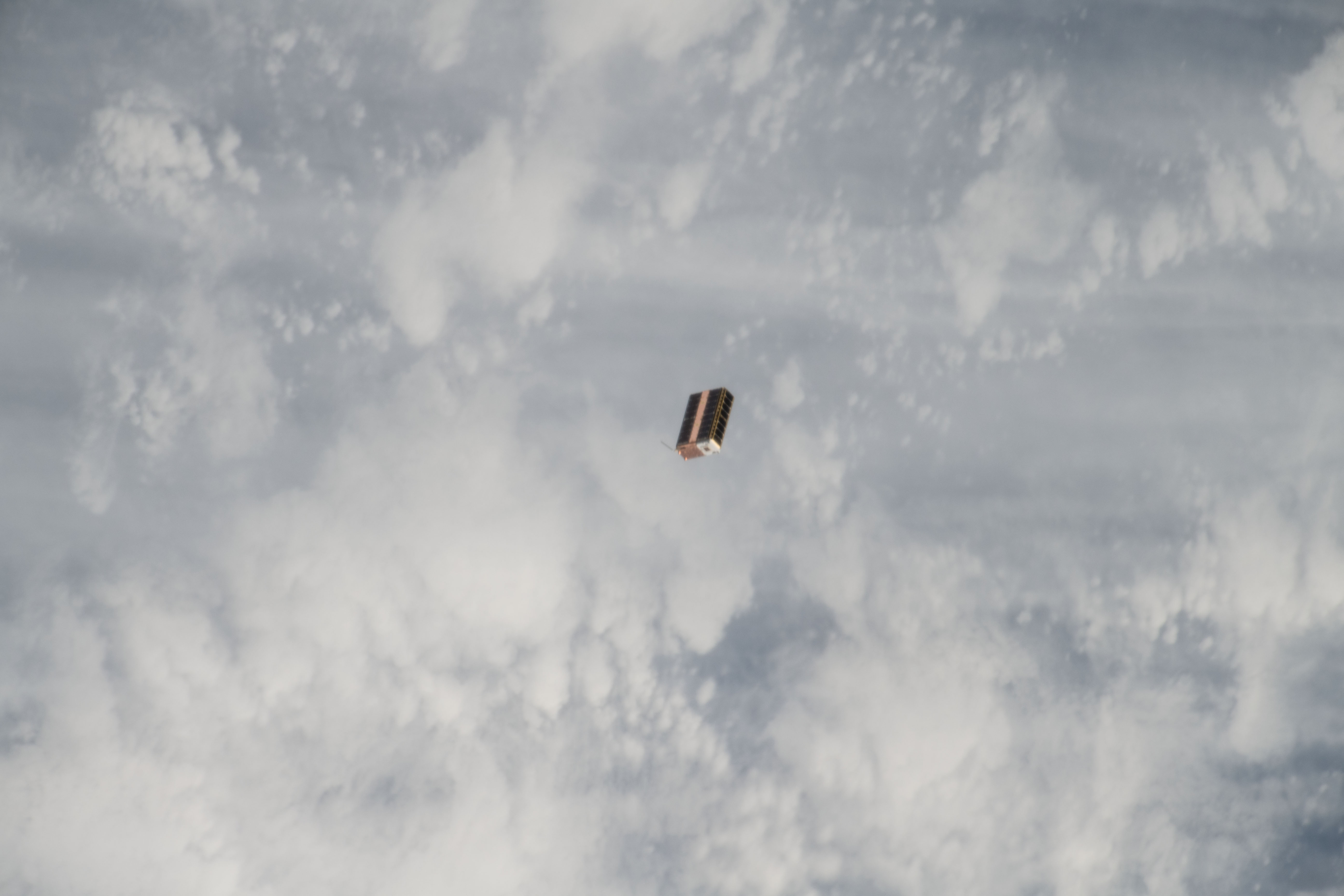 iss053e216632 (Nov. 20, 2017) --- The EcAMSat, short for E. coli AntiMicrobial Satellite, is seen moments after being ejected from the NanoRacks CubeSat Deployer attached to the outside of Kibo laboratory module from the Japan Aerospace Exploration Agency. The E. coli AntiMicrobial Satellite (EcAMSat) mission will investigate space microgravity effects on the antibiotic resistance of E. coli, a bacterial pathogen responsible for urinary tract infection in humans and animals.