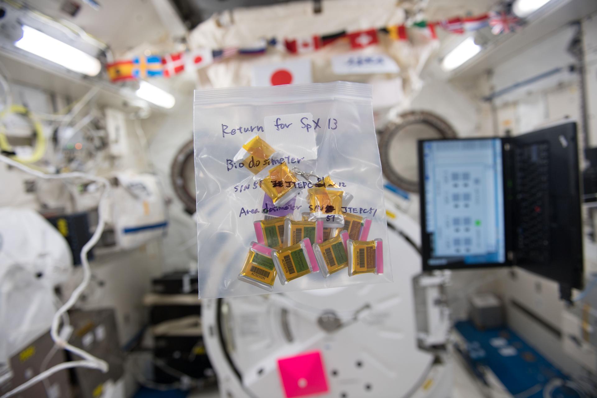 iss054e019981 (1/9/2018) --- Photo documentation of Bio Dosimeters removed form the Japanese Experiment Module (JEM) Tissue Equivalent Proportional Counters (J-TEPC) packed in a ziplock bag for return to Earth. Photo was taken in the Kibo Japanese Experiment Pressurized Module (JPM) aboard the International Space Station (ISS) during Position Sensitive Tissue Equivalent Proportional Chamber (PS-TEPC) experiment operations (OPS).