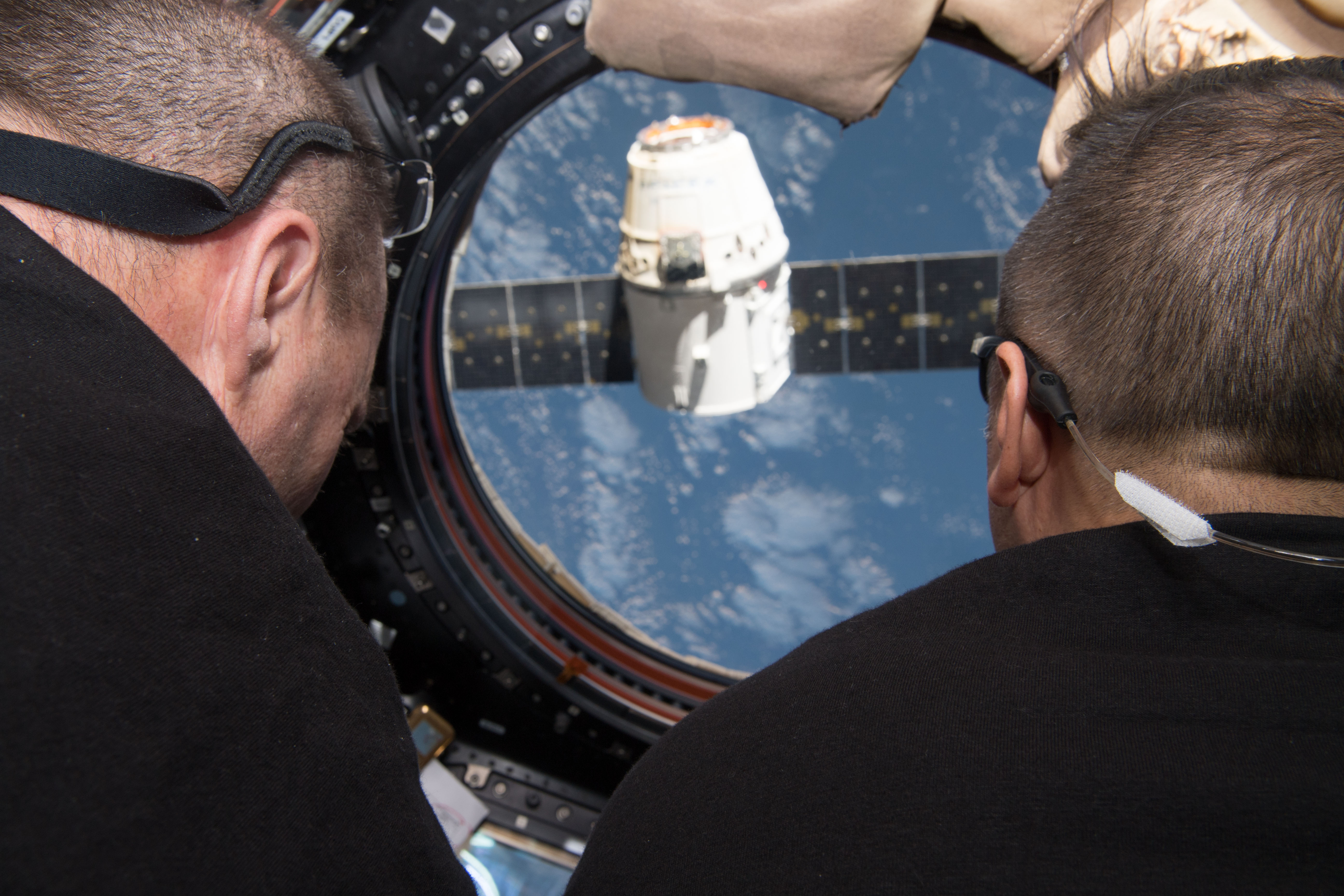 iss054e022060 (Jan. 13, 2018) --- Flight Engineers Scott Tingle (left) and Joe Acaba monitor the departure of the SpaceX Dragon resupply spacecraft through windows in the Cupola module.